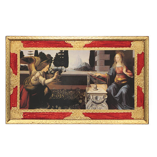 Darstellung der „Verkündigung“ (1472–1475) von Leonardo da Vinci (1452–1519), in hochauflösender Qualität auf eine Tafel aus Pappelholz gedruckt.