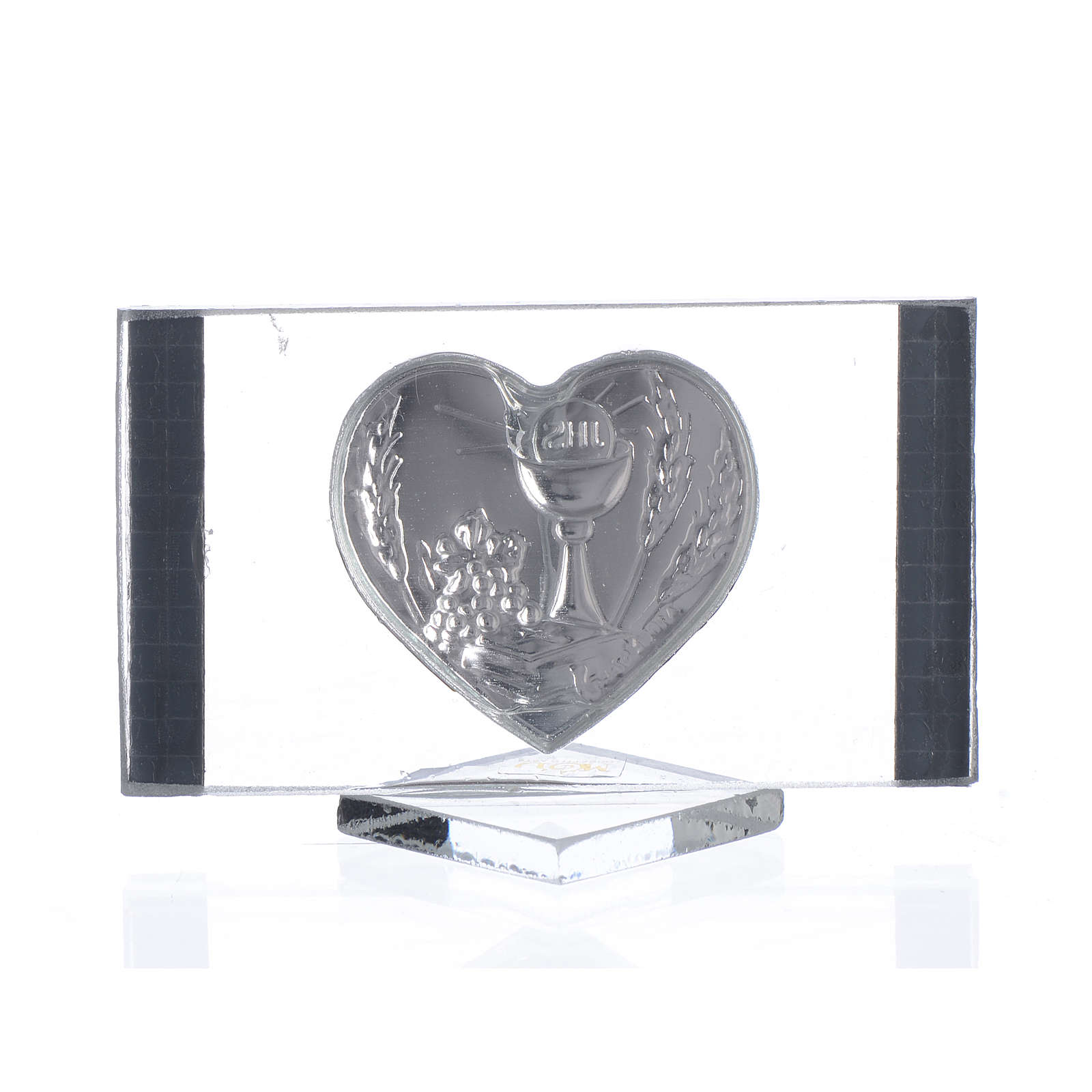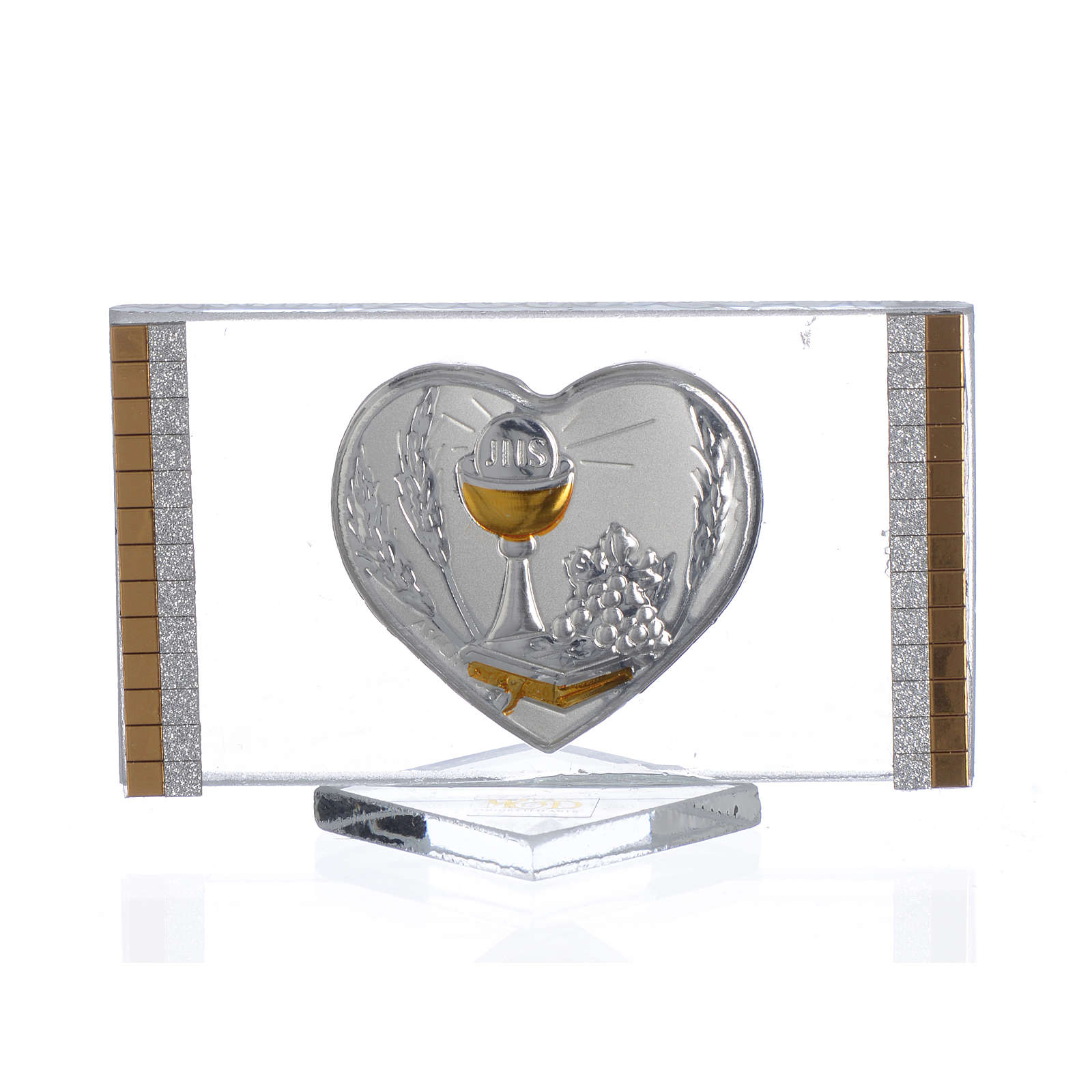 Erstkommunion Bombonniere Herz 4,5x7cm. Bombonniere realisiert aus Glas mit Herz aus Walzsilber und vergoldeten Rand.