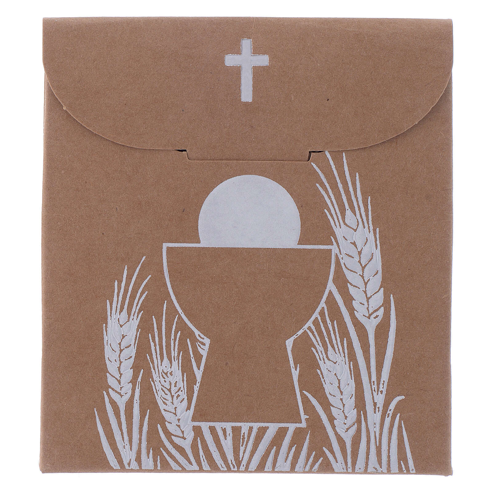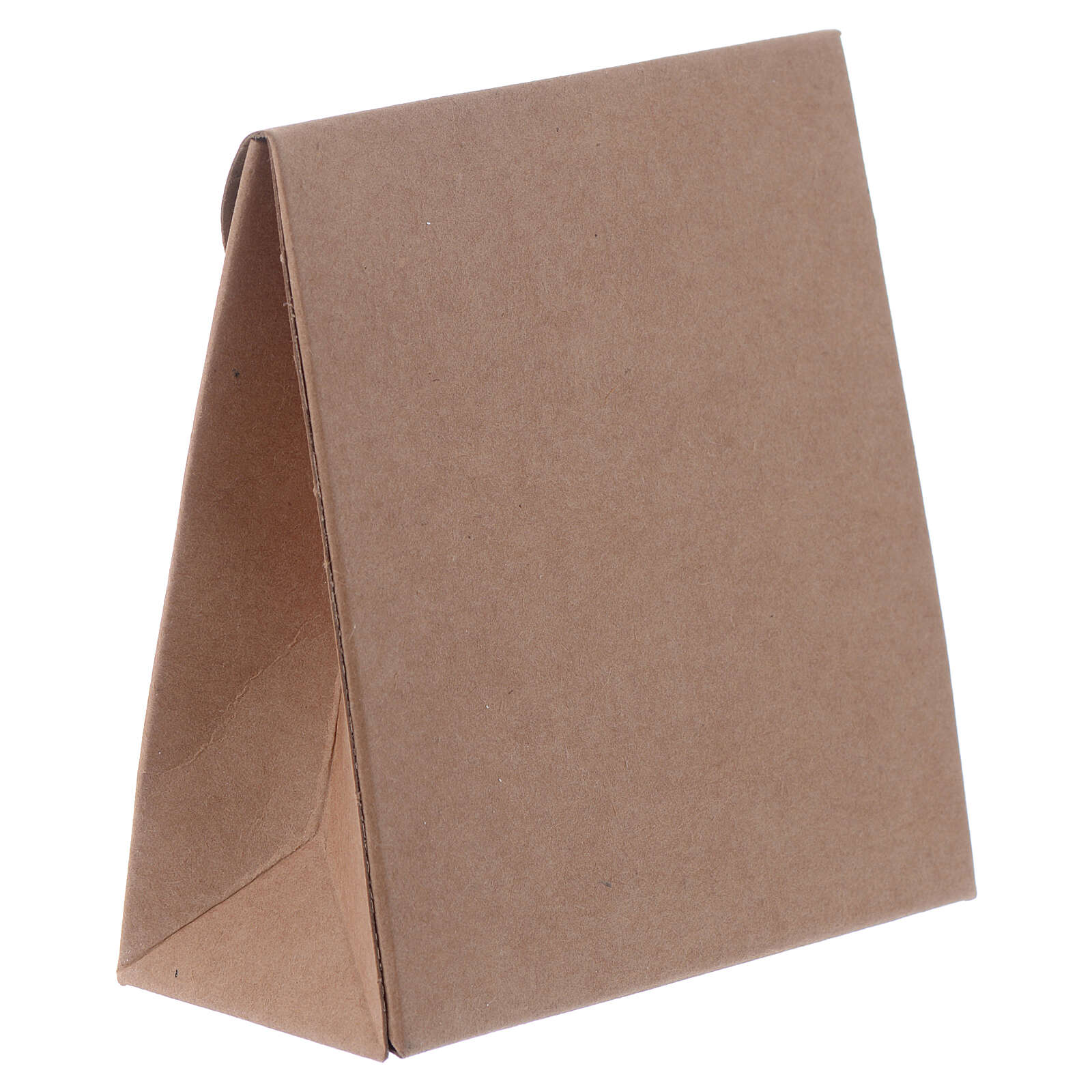 Brauner kleiner Umschlag mit weißem Druck und den Maßen 8x7x3 cm.