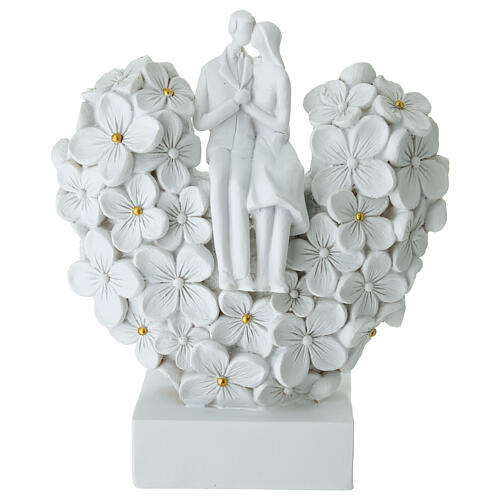 Weiße Harzstatuette mit einem dekorierten Herz aus zarten Blumen, verziert mit goldenen Staubblättern. In der Mitte umarmt sich ein verliebtes Paar liebevoll und tauscht einen zärtlichen Kuss aus. Auf der Rückseite befindet sich eine kleine Schale, ideal für Blümchen oder andere Dekorationen, um die Komposition zu personalisieren. Misst 16 cm in der Höhe, 12 cm in der Breite und 6 cm in der Tiefe.