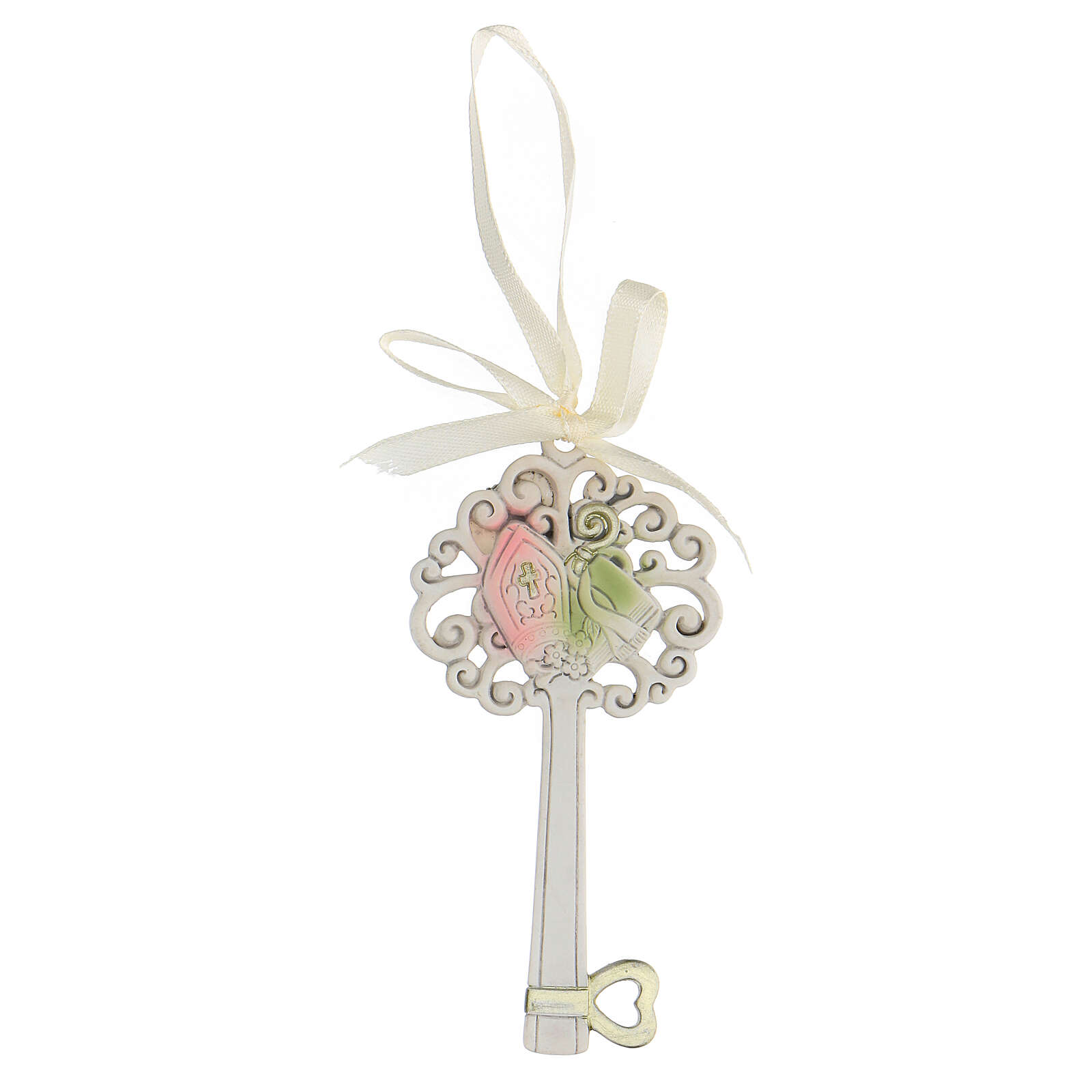 Dieser schöne aus Harz gefertigte Schlüssel wurde mit einer weißen Schleife und den farblich hervorgehobenen religiösen Symbolen verziert.