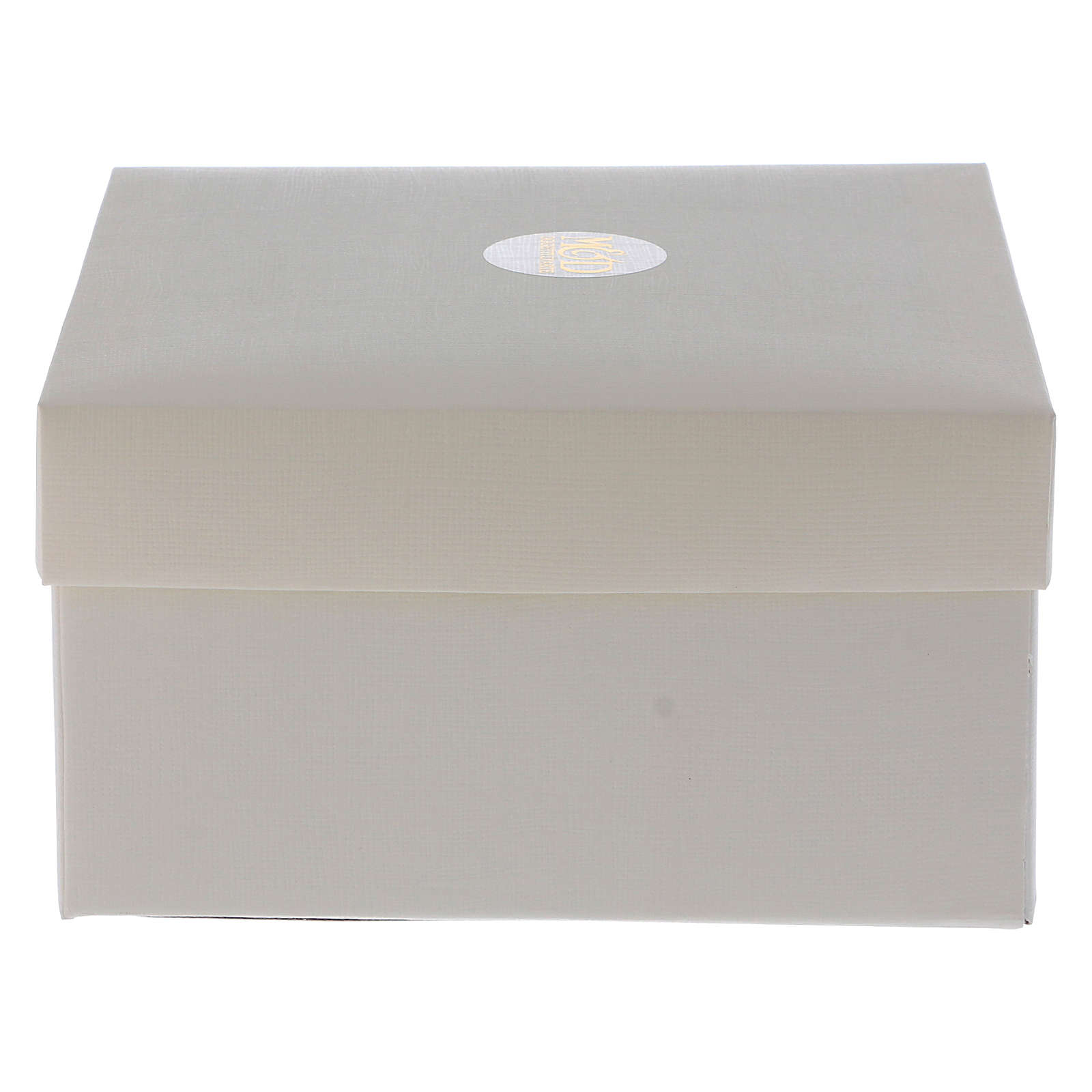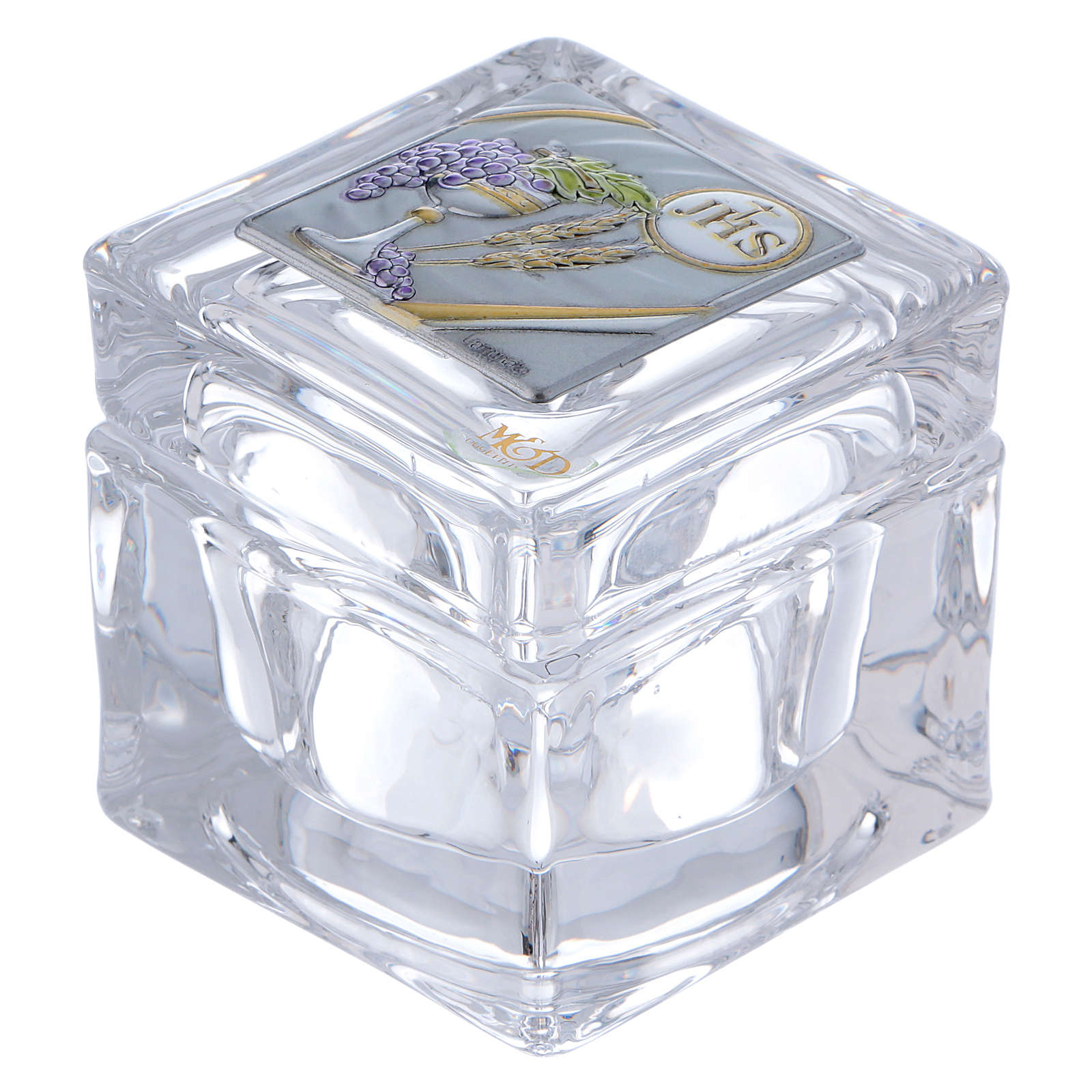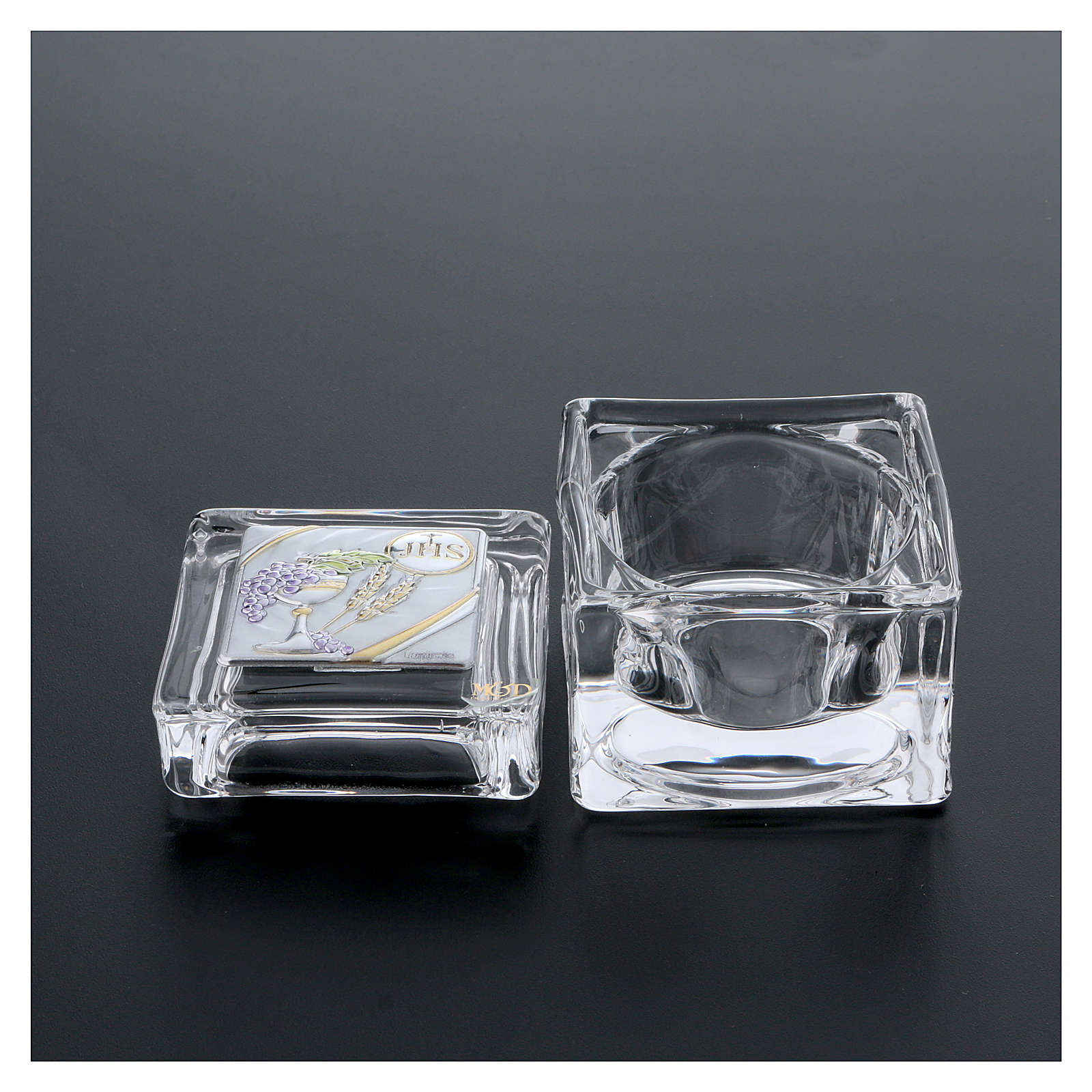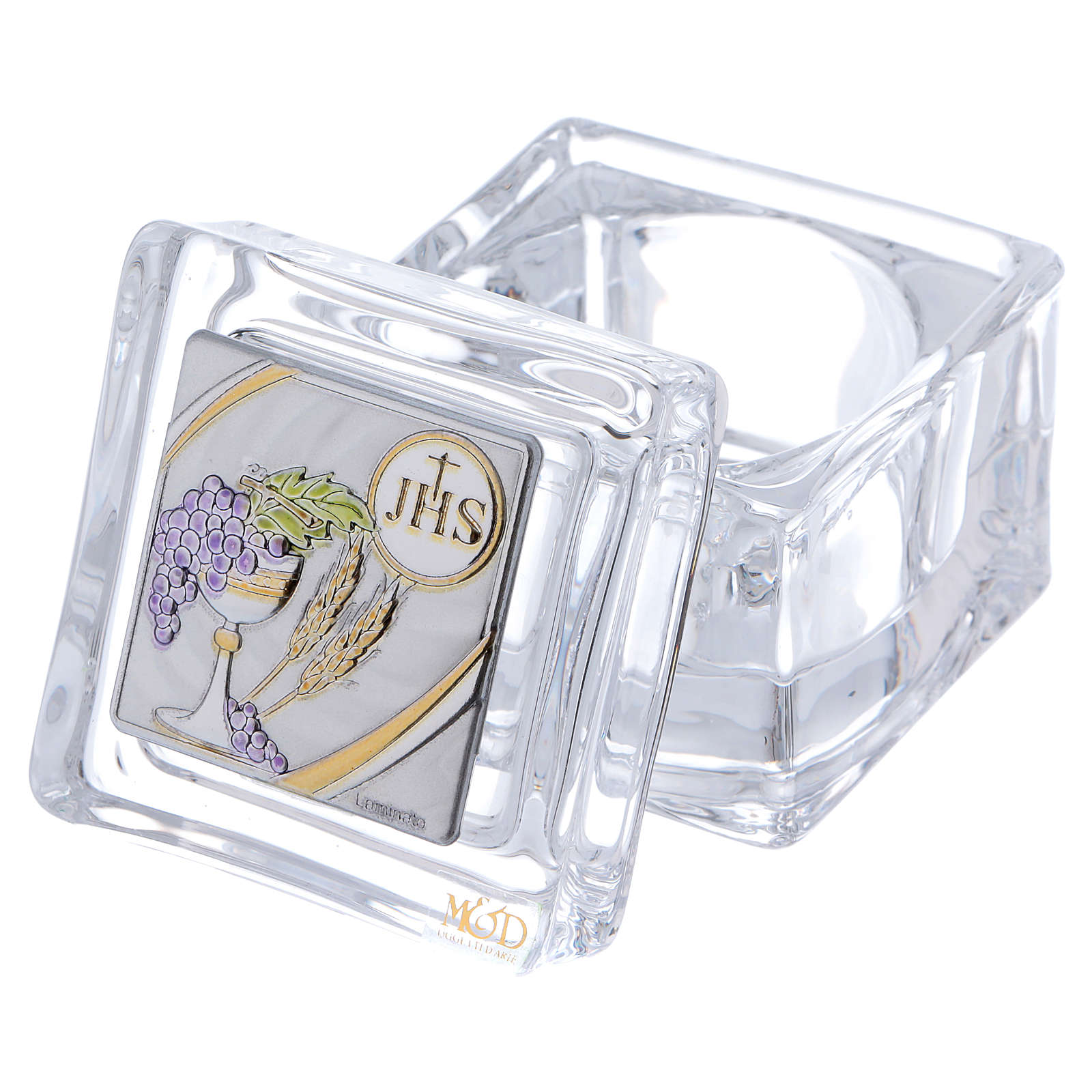 Geschenkidee für Erstkommunion: Teelichthalter aus Kristall mit Geschenkbox, Maße: 5x5x5 cm. Der Deckel des Kristallteelichthalters ist mit einem Silberlaminat verziert, das die Symbole der Erstkommunion zeigt. Der Teelichthalter aus Kristallglas wird vollständig in Italien gefertigt.