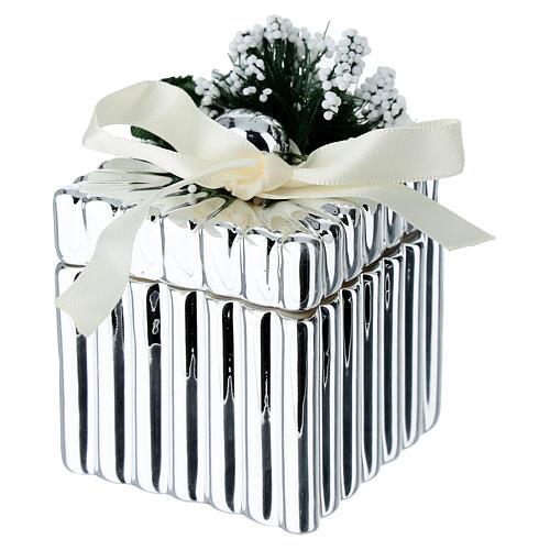 Gastgeschenk in Form einer versilberten Schachtel, mit einem Deckel verziert mit einer raffinierten weißen Schleife und grünen und weißen Kunstblumen. Die Schachtel ist 5,7 cm hoch und 5,5 cm breit und lang.