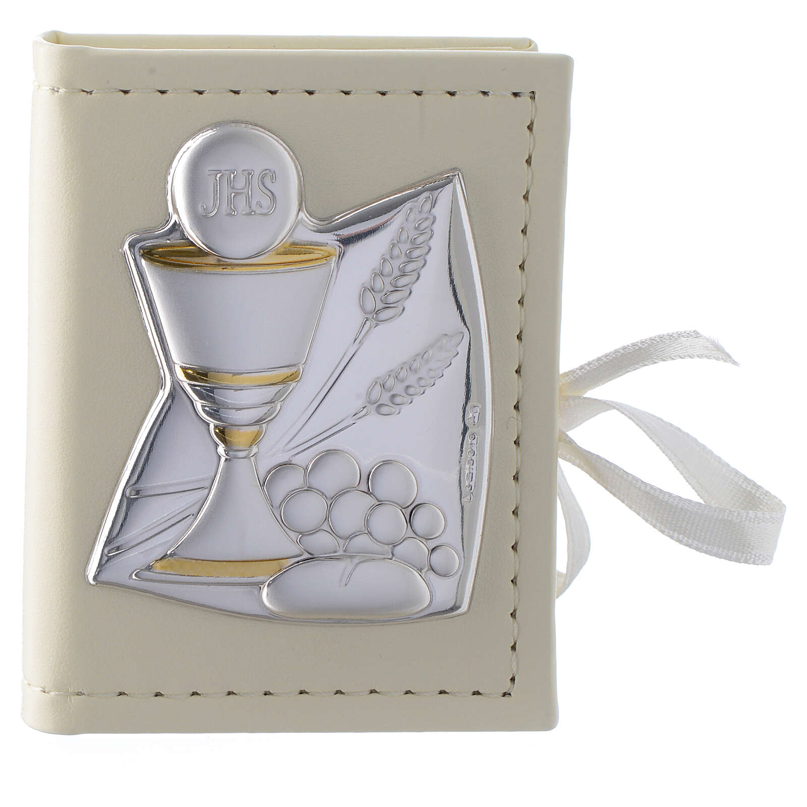 Rosenkranz zur Kommunion in Etui aus Kunstleder mit silberner Plakette