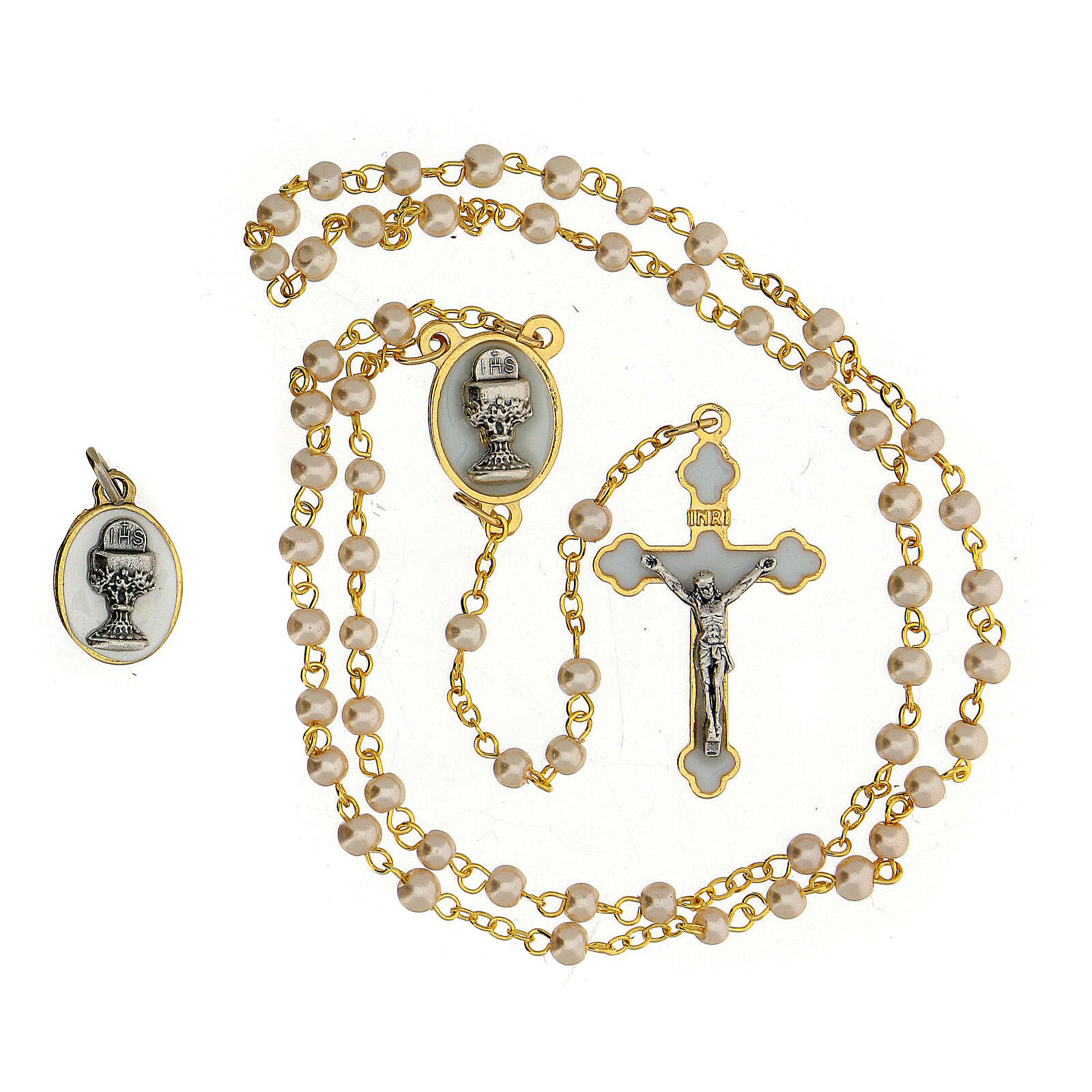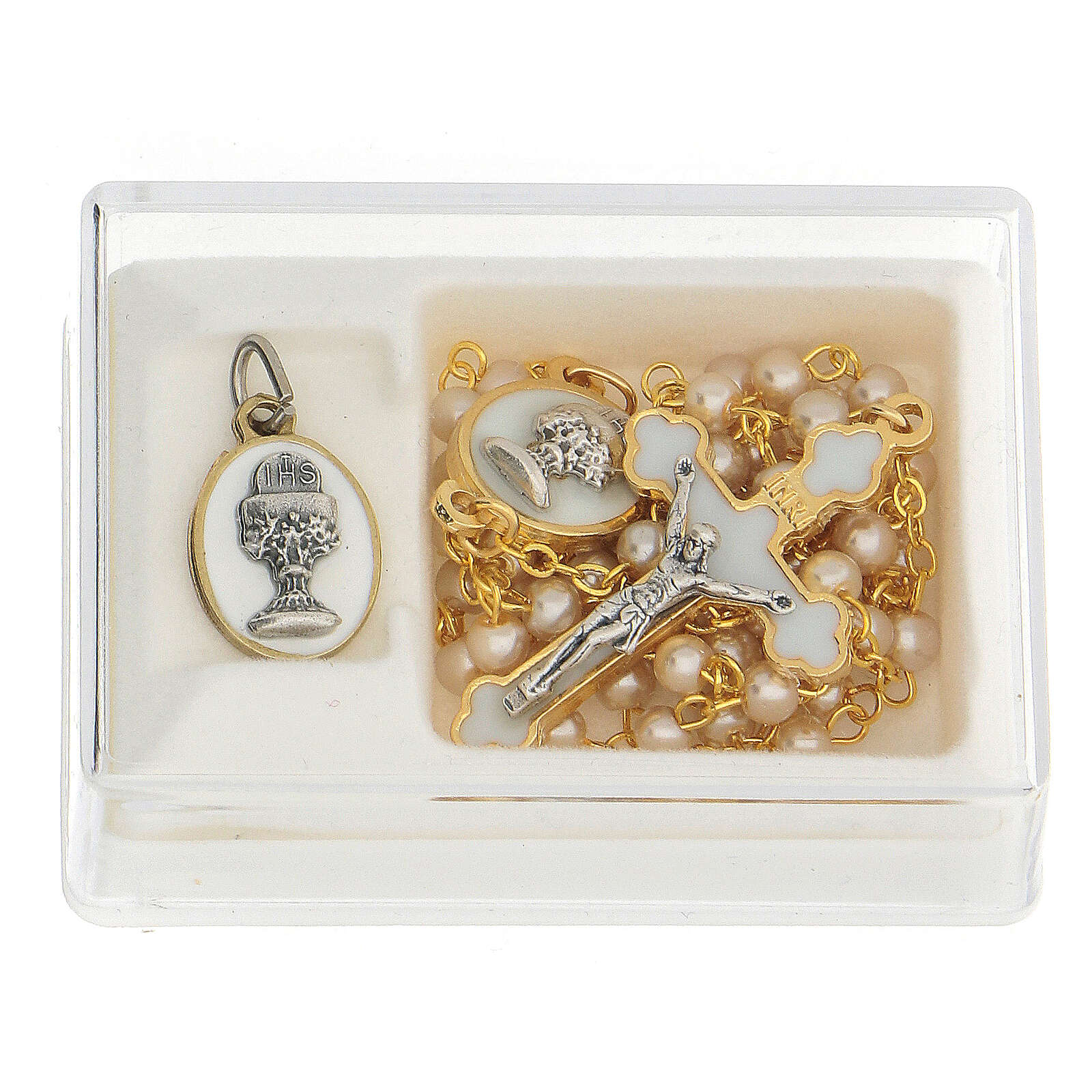 Set aus Rosenkranz und Anhänger in gold und weiß zur Kommunion.