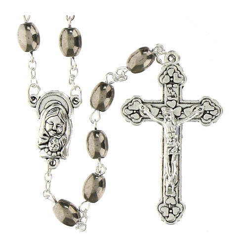 Rosenkranz mit ovalen Silberglasperlen in der Größe von 6x9mm, mit einer Umfangslänge von 82 cm. Die Medaille aus Metall zeigt auf der einen Seite das Heilige Herz Jesu und auf der anderen Seite die Gottesmutter mit Kind. Das Kreuz ist mit Herzen und der Aufschrift INRI verziert, besteht aus Metall und misst 4,5x3cm.