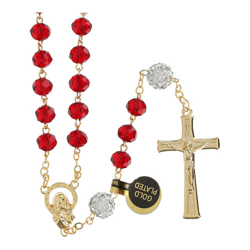 Die Dekaden bestehen aus roten Prismaperlen und werden von 6 mm weißen Pater-Perlen unterbrochen, die mit funkelnden Zirkonen verziert sind und dem Rosenkranz Leuchtkraft und Wert verleihen.
