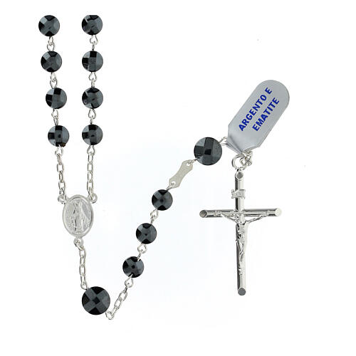 Rosenkranz hergestellt in Italien, mit Ave Maria Perlen 6 mm und Pater Perlen 8 mm, alle aus flach facettierter Hämatit. Die Kette, das 3,5x2,5 cm große Kruzifix und die 1,2x0,8 cm große Medaille sind aus Silber 925. Die Medaille zeigt eine Plakette mit der Wundertätigen Medaille und hat einen Umfang von 66 cm.