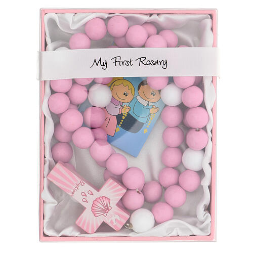 Rosenkranz mit rosafarbenen Holzperlen und kleinem Heftchen auf Englisch, 15 mm.