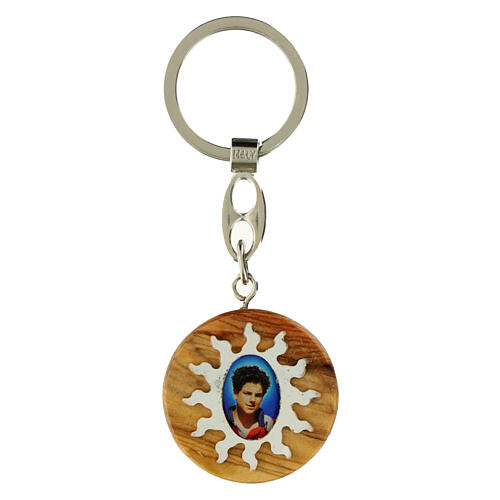 Schlüsselanhänger Carlo Acutis mit Olivenholzmedaille 3 cm weiße Strahlen
