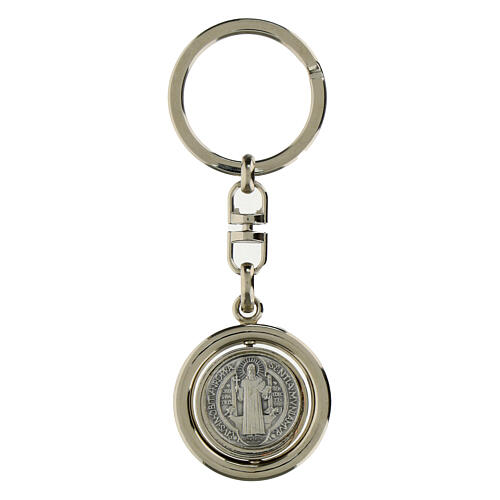 Drehbarer Schlüsselanhänger aus Metall mit silberfarbener Benediktusmedaille. Der Schlüsselanhänger wurde von einem italienischen Unternehmen gefertigt, das seit über dreißig Jahren Medaillen und religiöse Artikel zum Thema des heiligen Benedikt herstellt.