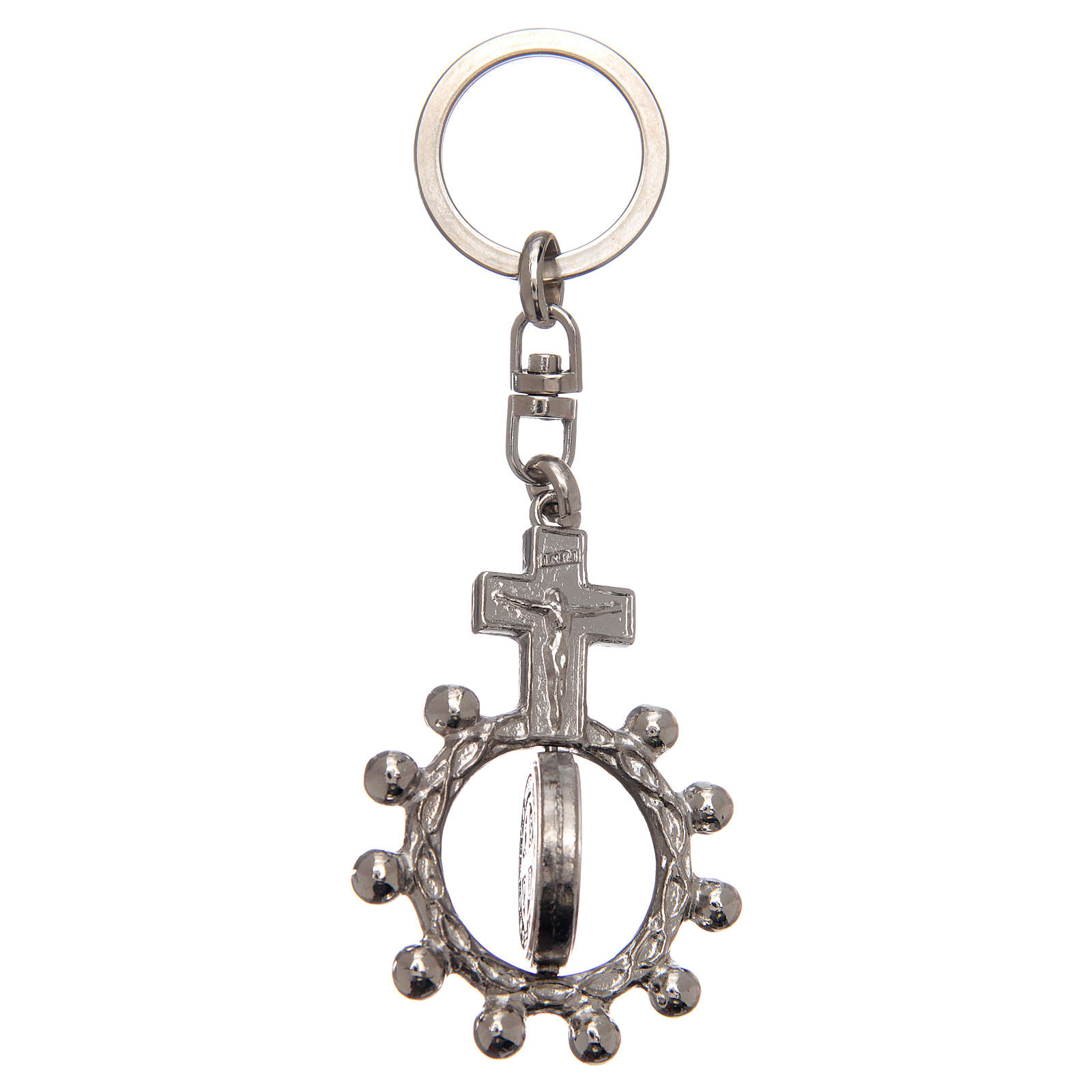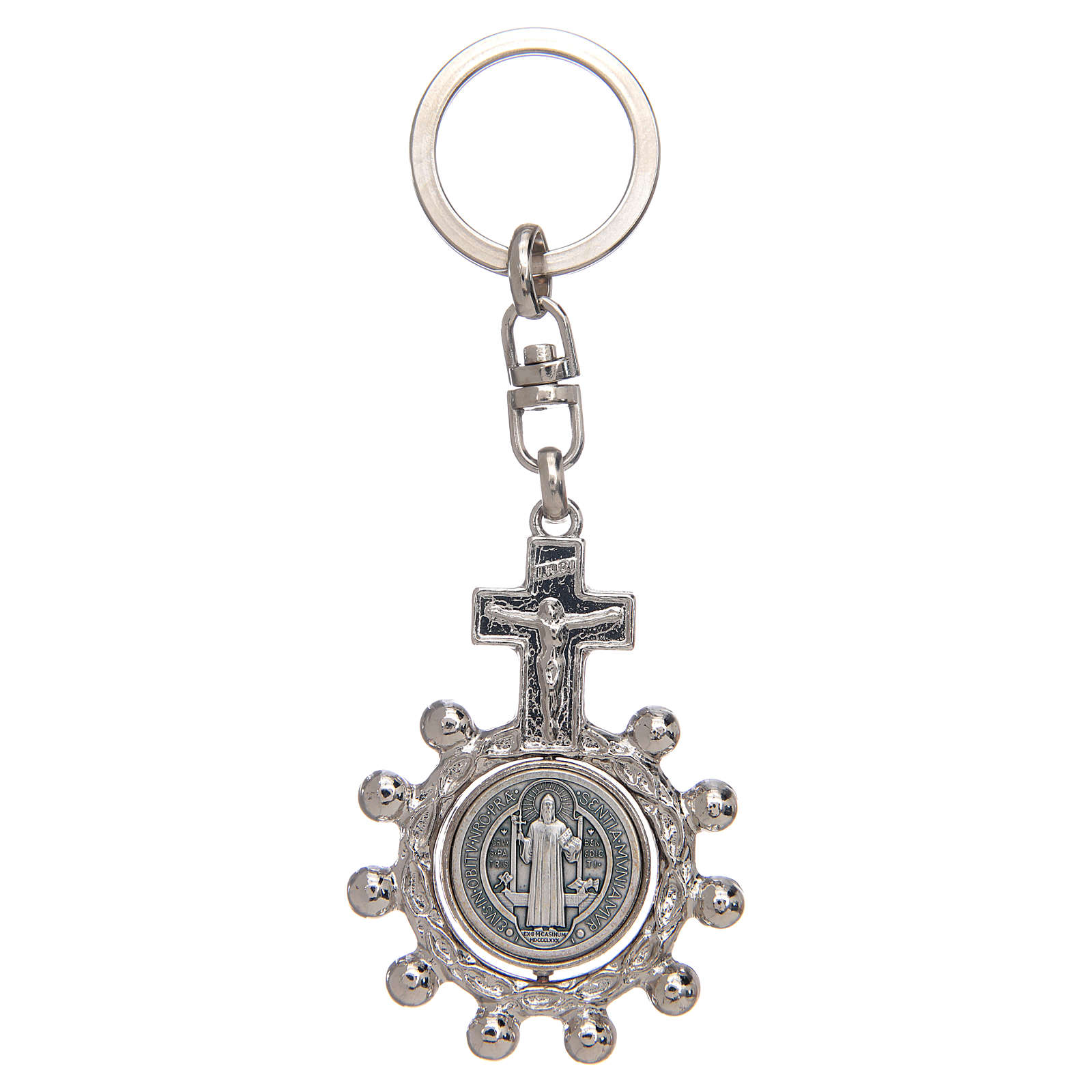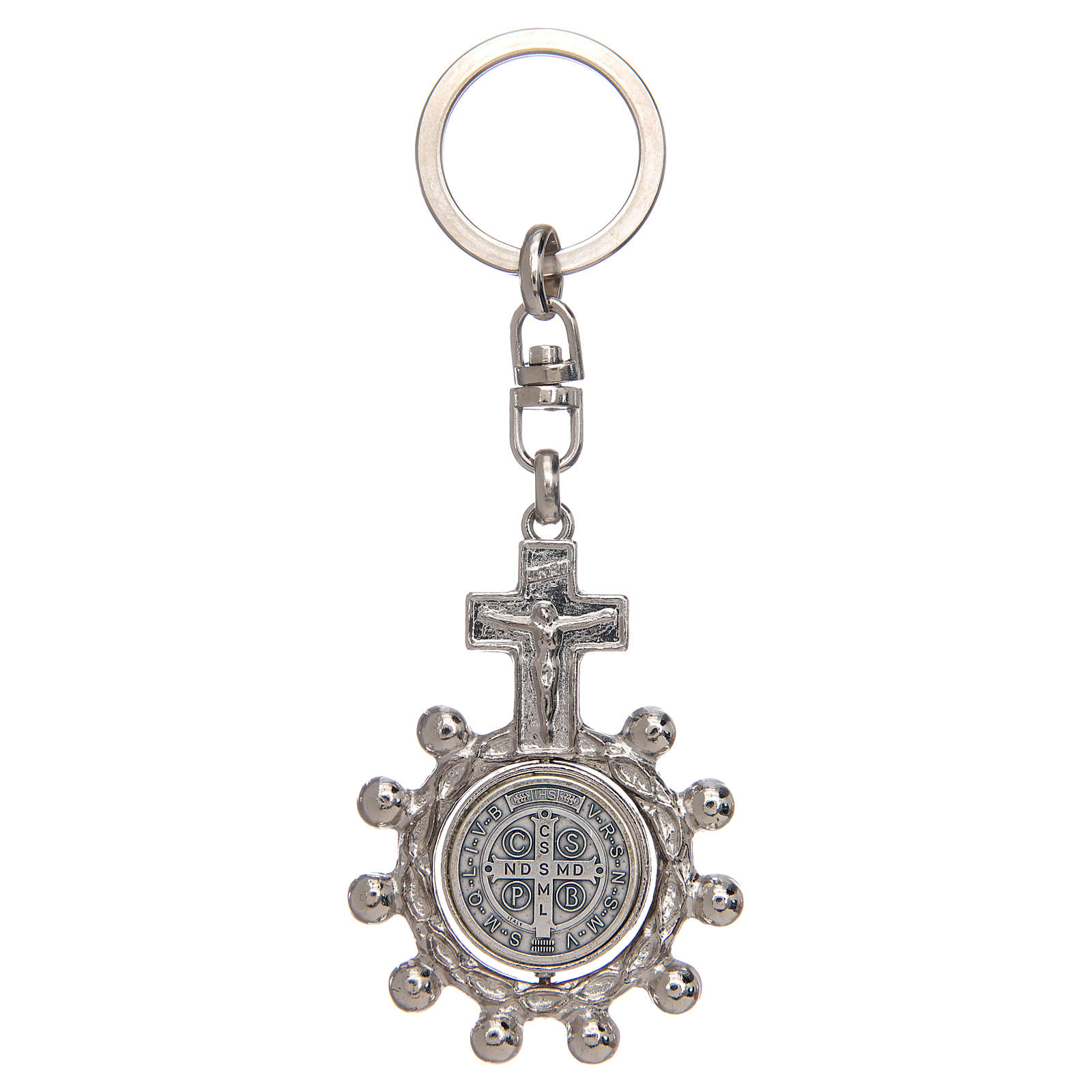 Kreise Schluesselanhaenger aus Metall. Es ist ein Rosenkranz. Die kleine Medaille zeigt ein Bild von dem Heiligen Benedictus auf einer Seite und das Kreuz von dem Heiligen Benedictus auf den anderen. Die Medaille dreht auf einem Bolzen. Es wird von italienischen Handwerken realisiert.
