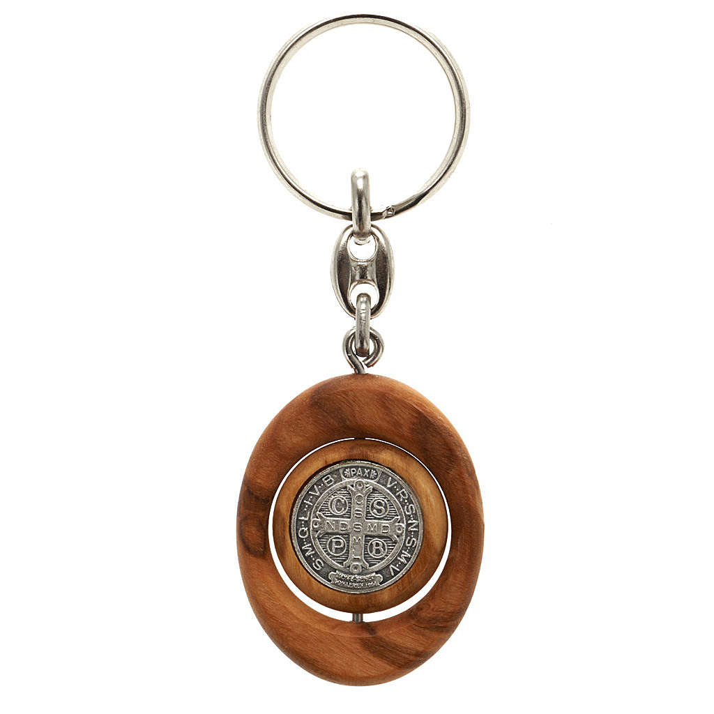 Schlüßel Anhänger Olivenholz Medaille Hl. Benedikt. Schlüßel Anhänger realisiert aus Olivenholz und verfeinert mit der Medaille vom Heiligen Benedikt.