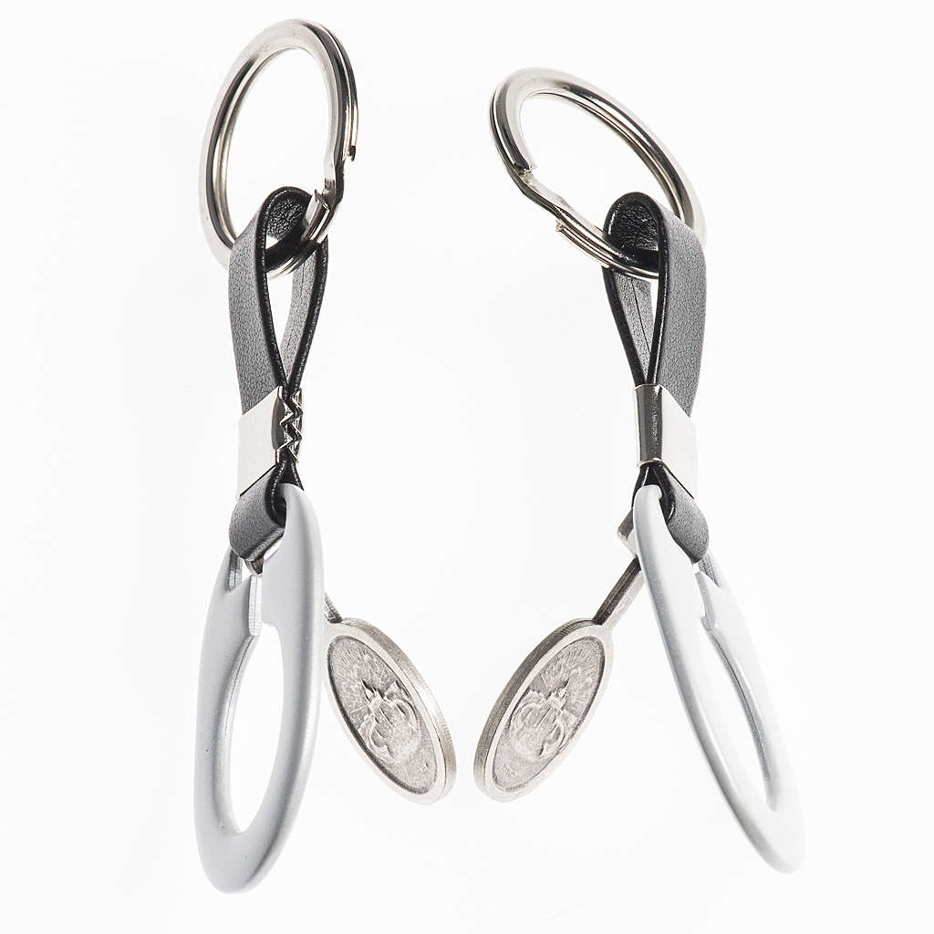 Schlüsselanhänger aus Metall Papst Benedikt XVI, mit galvanischem Bändchen aus schwarzem Kunstleder und Effekt von antikem Silber weiß.