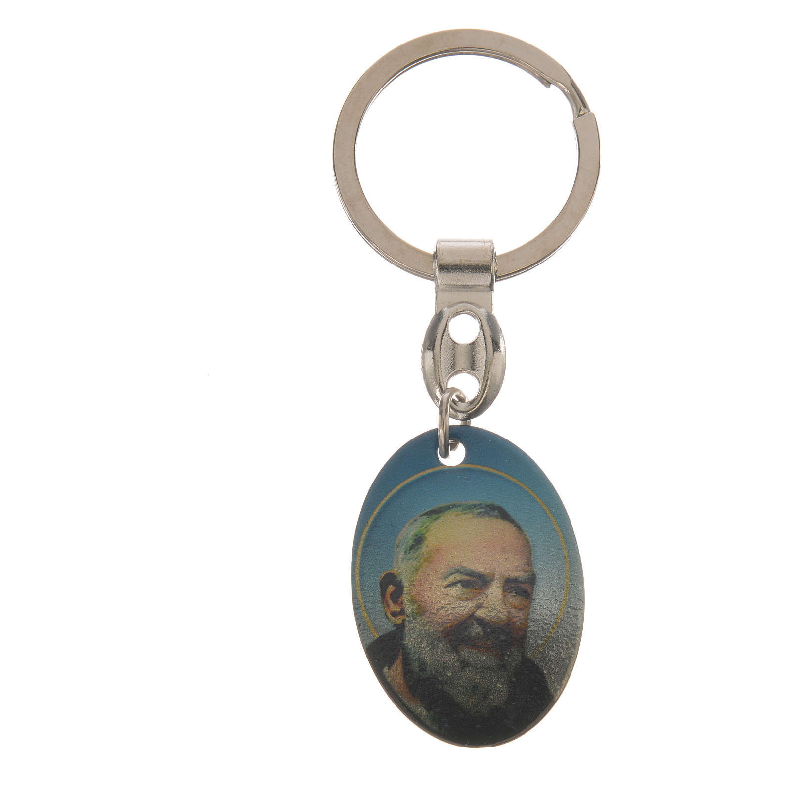 Schlüsselanhänger aus versilbertem Metall, die Medaille ist in ovaler Form gestaltet und hat die Maße: 2,5x3,5 cm. Die Medaille zeigt ein Bild von Pater Pio.