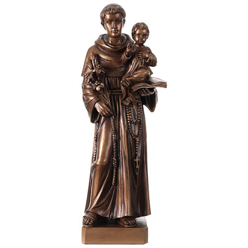 Bronzefarbene Fiberglas-Statue des Heiligen Antonius, ideal für den Innenbereich. Der Heilige hält das Jesuskind in den Armen in einer Geste von Sanftmut und Hingabe. Gefertigt in Italien im renommierten Grödnertal, wo seit über 120 Jahren Meisterhandwerker Kunstwerke von außergewöhnlicher Schönheit und Einzigartigkeit schaffen.
