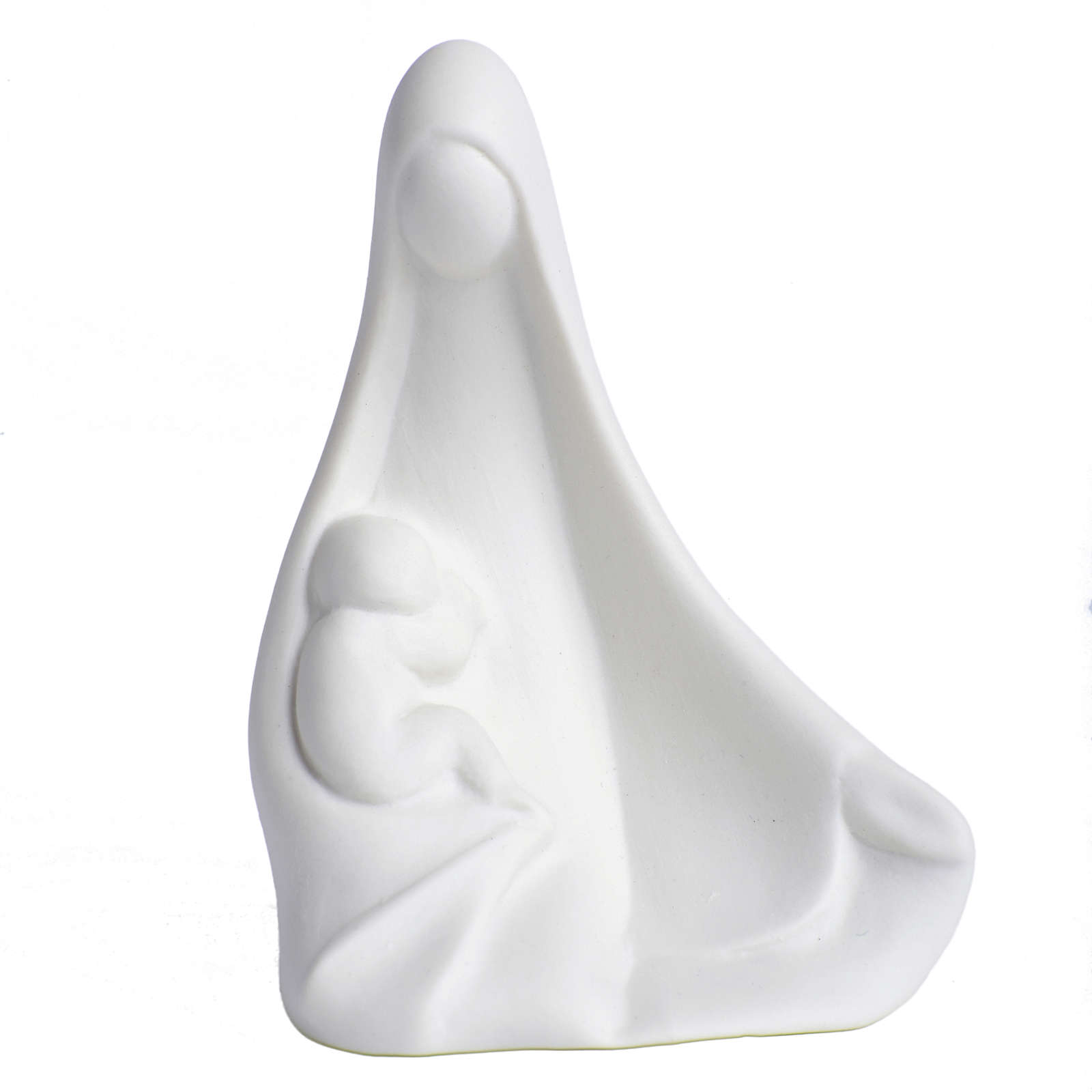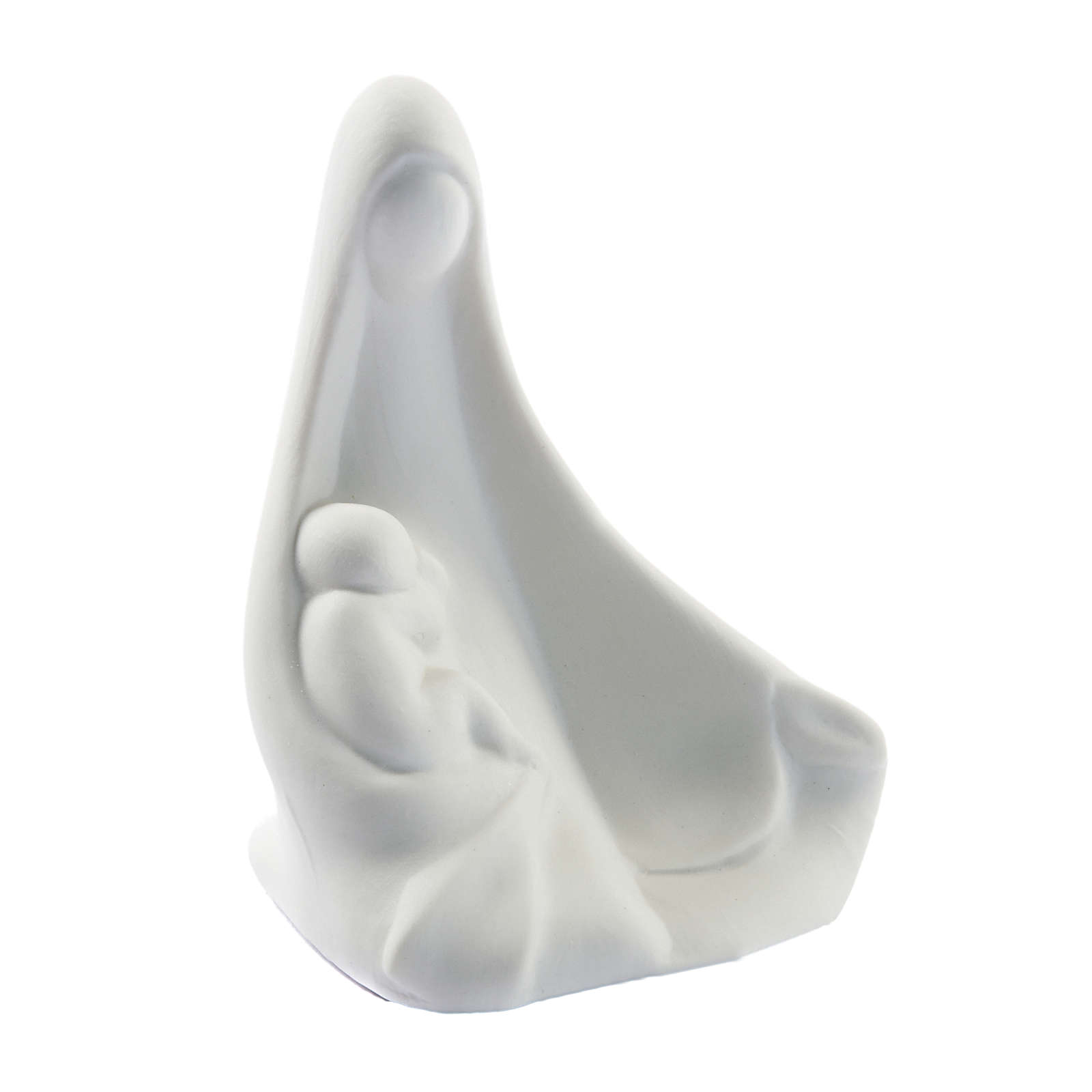 Kleine Statua der sitztenen Maria der den Jesus haelt; sie ist von Francesco Pinton aus weissen Porzellan realisiert.