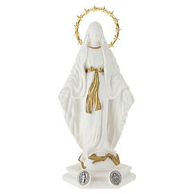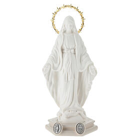 Gottesmutter von der Wunderbaren Medaille aus weißem Resin mit Basis mit reliefierten Medaillen – 10 cm