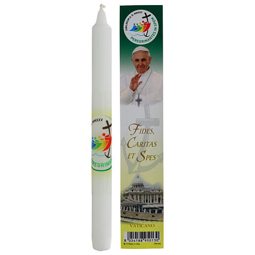 Auf der Kerze ist das offizielle Logo des Jubiläums 2025 zu sehen. Begleitet von einer Karte mit dem Jubiläumslogo, dem Bild von Papst Franziskus, dem Motto des Jubiläums 'Fides, Caritas et Spes' und einer Darstellung der Petersbasilika.