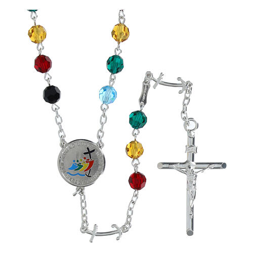 Jubiläumsrosenkranz 2025 Silber 925 0,6 cm Kristallperlen. Ein tragbarer Rosenkranz aus Silber 925, veredelt mit einer runden Medaille, die die Madonna mit dem Jesuskind auf der einen Seite und das Jubiläumslogo 2025 ''Pilger der Hoffnung'' auf der anderen Seite zeigt. Die facettierten Kristallperlen mit einem Durchmesser von 0,6 cm greifen die offiziellen Farben des Jubiläums auf, während die Dekaden von Kreuzen getrennt sind, die mit einem Ankerabschluss von 1,5x0,5 cm verziert sind, dem m...