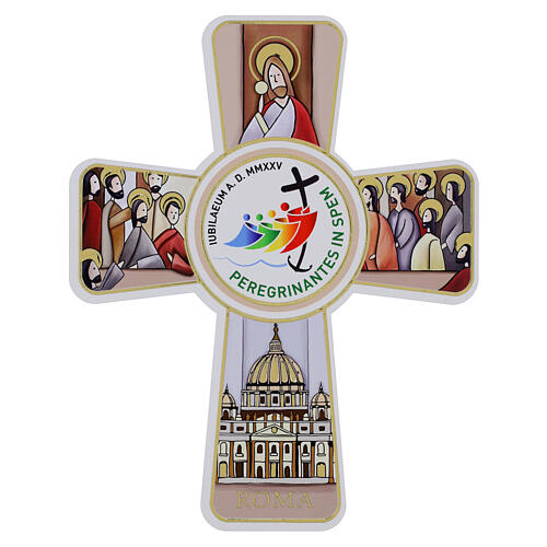 Zu den Seiten und oben sind Jesus und die Apostel abgebildet, während in der Mitte das offizielle Logo des Jubiläums 2025 in lateinischer Sprache hervorgehoben ist.