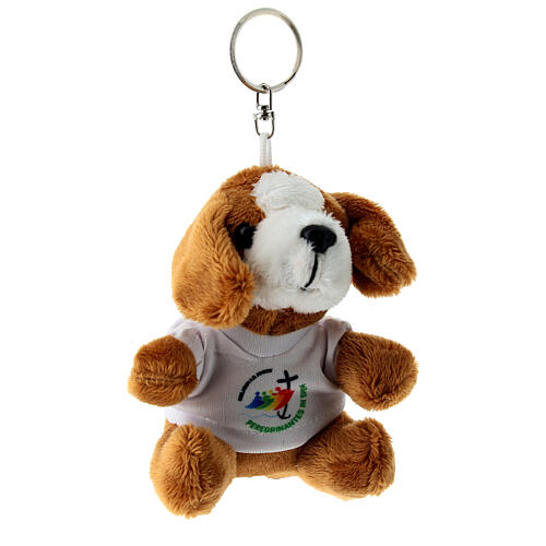 Plüsch-Schlüsselanhänger Hündchen Jubiläumslogo 2025. Dieser Schlüsselanhänger zeigt ein entzückendes Hündchen, das ein weißes T-Shirt mit dem offiziellen Jubiläumslogo 2025 trägt, begleitet vom lateinischen Motto. Ein kleines, weiches und zart gefärbtes Spielzeug, ideal als Geschenk oder als niedliche Erinnerung für das heilige Jahr.