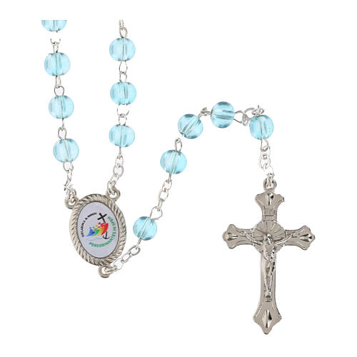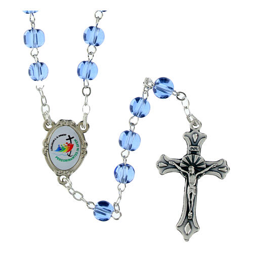 Rosenkranz aus 6 mm blauen Glasperlen mit offiziellem Jubiläumslogo 2025 und Schachtel