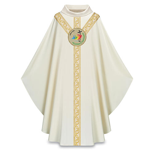 Kasel im gotischen Stil mit Schalkragen zum Jubiläum 2025 "Pilger der Hoffnung", hergestellt im Atelier Slabbinck, Material: 70% Polyester, 30% Viskose (Dupionstoff), Farbe: Elfenbein, Logo-Motto: FRANZÖSISCH.