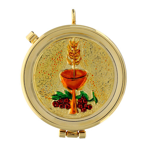 Versehpatene Messing Kelch und Trauben 5.3cm. Versehpatene realisiert aus Messing und verfeinert mit den Symbolen von Kelch und Trauben dekoriert mit Emaillack.