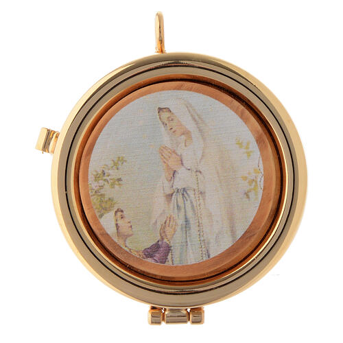 Versehpatene Messing und Olivenholz Lourdes 6cm. Versehpatene realisiert aus Messing und verfeinert mit Bild der Gottesmutter von Lourdes auf einer Olivenholz Platte.