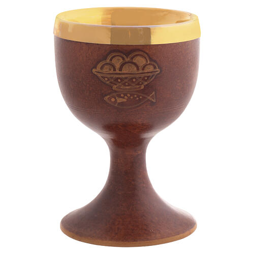 Kelch aus Keramik und vergoldeten Messing; er ist draussen dekoriert, handgemacht und handgemalt. Die moegliche Farben sind: Terrakotte oder Elfenbein-Farbe mit vergoldeten Dritte-Feuer-Streifungen oder Leder, Blau und hell Braun mit Dekorationen. Man kann die Farbe unten dem Bild waehlen.