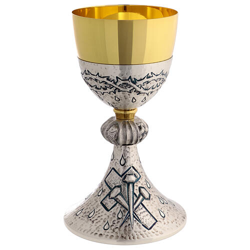 Der Kelch zeigt eine gehämmerte Oberfläche, die mit einer Dornenkrone und symbolischen Tropfen gestaltet ist, welche das Blut darstellen.
