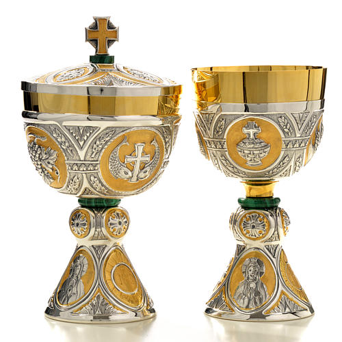 Tassilo Kelch und Ziborium aus Messing handziseliert. Kelch und Ziborium werden aus Messing realisiert und mit Malachite verfeinert, ähnlich zu dem Mod. Tassilo.