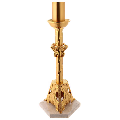 Basis aus vergoldeten Bronze um die grosse Kerze zu halten. Sie ist mit Engeln auf die vier Seiten und mit der Basis aus roten Marmor aus Verona dekoriert. Sie koennen auch den Armleuchter , die Kerzenhalter, die Mauer-Kreuze, die Lampe und die Basis fuer die Kreuze von dem gleichen Stil kaufen. Sie werden von einer italienischen Firma produziert; diese Firma hat eine mehrjaehrige Erfahrung in die Bearbeitung diesen liturgische Dinge. Die originale Zeichnungen, die hohe Qualitaet sind die Merkmalen diese Produkten.
