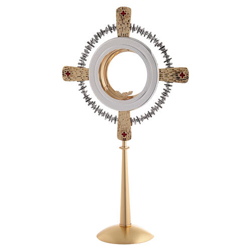 Strahlenkranz Monstranz für Hostie Magna, mit Kreuz und rotem Email. Sie ist aus Gussmessing mit goldener Verzierung aus Bad von Gold 24K und wird in Italien geschafft, von Handwerkern, die Experte in der Bearbeitung heiliger Einrichtung sind. Gesamtgrösse 72 cm, Durchmesser des Bullauges 16 cm.