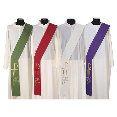 Diakon Stola Fisch Brot und XP aus Polyester. Die Stola ist aus Polyester realisiert, und ist mit Fisch und Brot und Chi-Rho dekoriert.