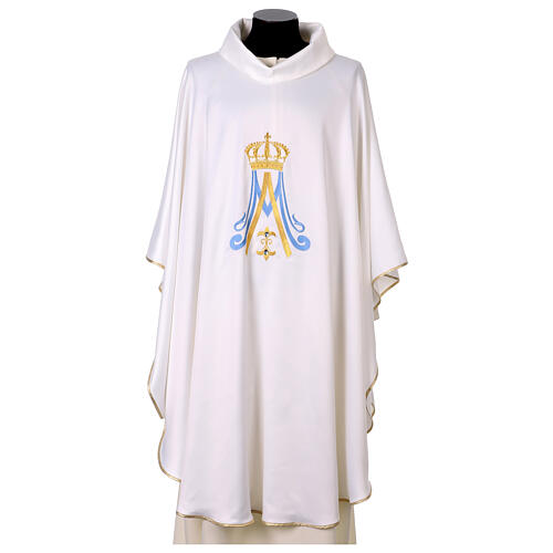 Kasel „Marianisch“ aus Baumwollmischgewebe mit Goldstickerei, blauen Schmucksteinen und Monogramm
