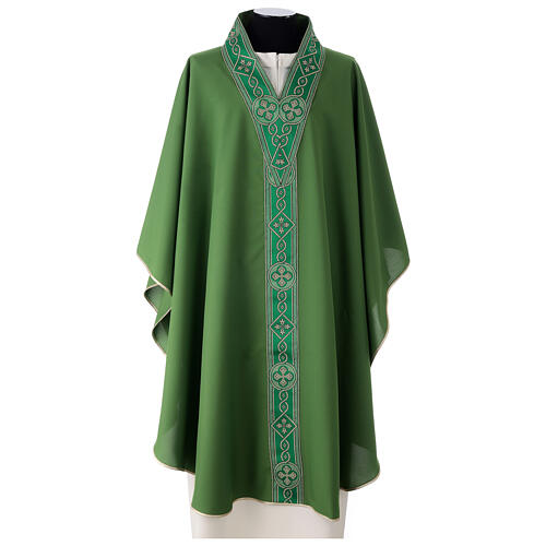 Diese Kasel wird vollständig in Italien gefertigt. Sie besteht aus Polyestergewebe Vatican und ist auf Vorder- und Rückseite mit einer Borte geschmückt. Die rückseitige Borte ist in Gold auf grünem Grund ausgeführt und zeigt Kreuze sowie geometrische Ornamente.