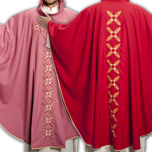 Kasel mit Stola rot und rosa aus Wolle; Stickereien aus Seide. Handwerksprodukt aus Italien.