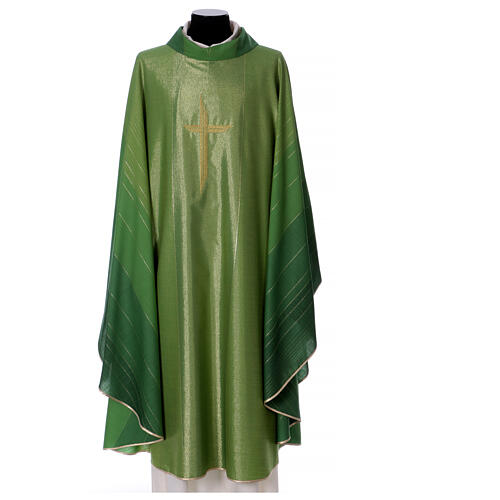 Kasel Wolle und Lurex Kreuz Maschinenstickerei . Kasel realisiert aus Wolle und Lurex und verfeinert mit einem goldenen Kreuz bestickt mit Maschine.