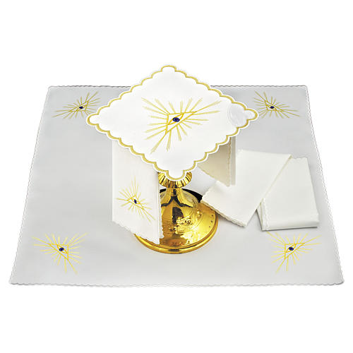 Kelchwäsche aus Leinen Auge Gottes. Kelchwäsche realisiert aus Leinen und dekoriert mit der Auge Gottes mit goldenen Strahlen.