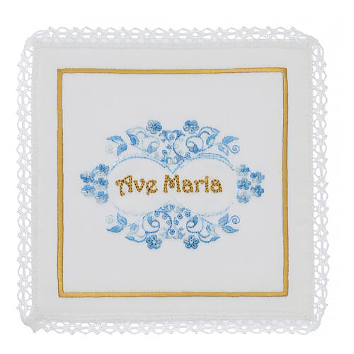 Kelchwäsche-Set, Ave-Maria-Schriftzug als Stickerei, aus Seide, Baumwolle und Viskose – 4-teilig