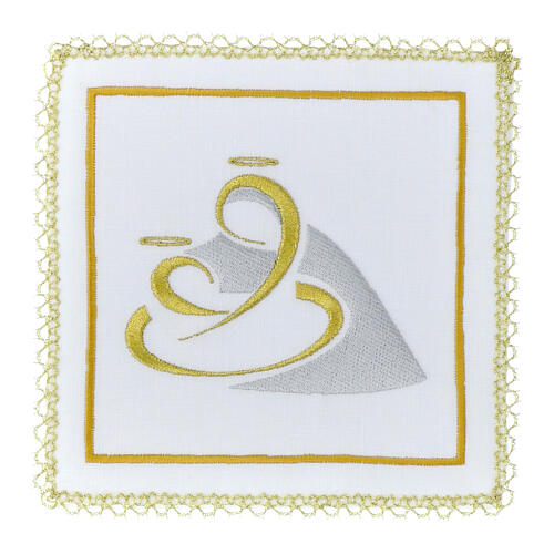 Dieses Kelchwäsche-Set wird in einer italienischen Paramentenwerkstatt kunsthandwerklich aus einem hochwertigen Gewebe gefertigt, bestehend aus 50 % Baumwolle, 40 % Seide und 10 % Viskose. Das weiße Gewebe ist von edler Qualität und trägt ein wiederkehrendes Stickmotiv mit der Darstellung der Gottesmutter mit Kind.