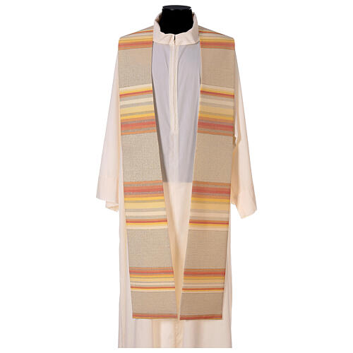 Liturgische Stola aus 100% Polyester mit goldener Fadenstickerei und Schattierungen von Orange, Gelb, Elfenbein, Beige und Weiß.