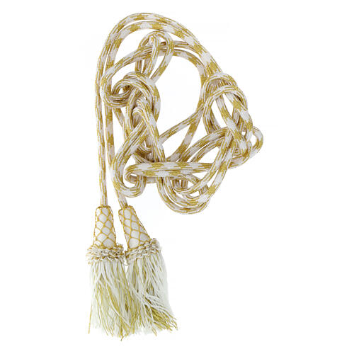 Zweifarbiges Priesterzingulum in Gold und Weiß mit Fransen aus Rebur und Quaste aus Tripolin.