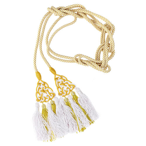 Priesterzingulum in weißer und goldfarbener, hochwertiger Ausführung mit fünf Quasten mit Canuttiglia.