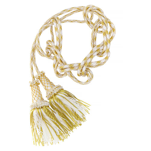 Priesterzingulum in weißer und goldfarbener, hochwertiger Ausführung mit Quaste mit Canuttiglia und Holzelement.