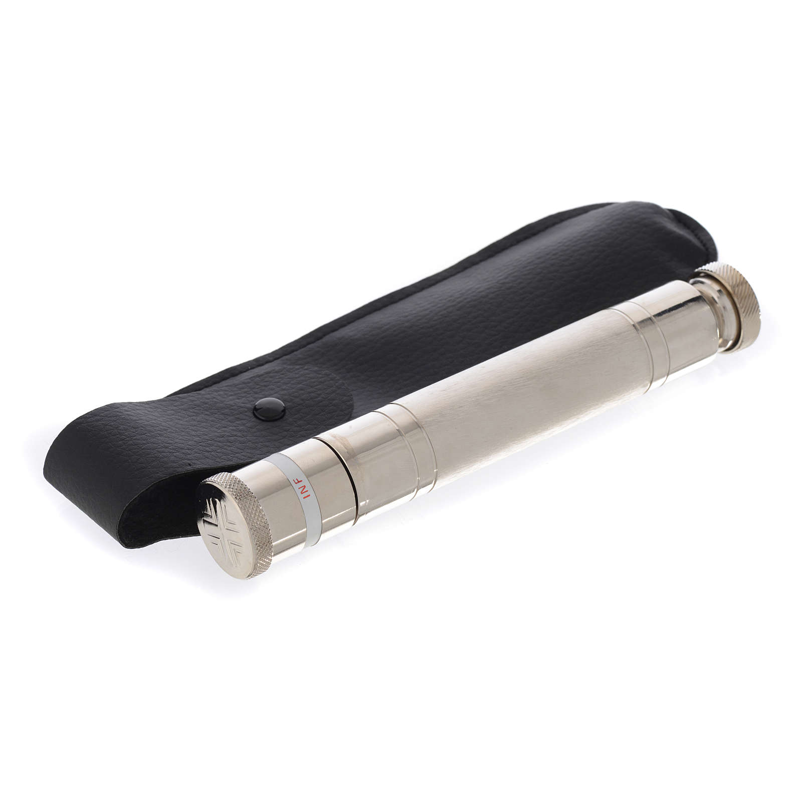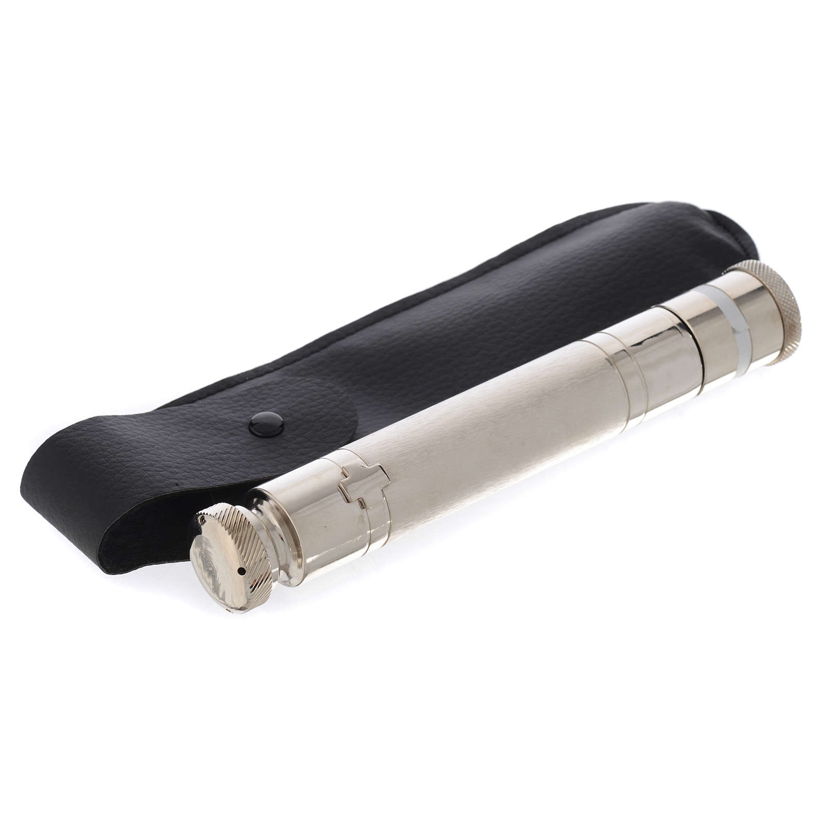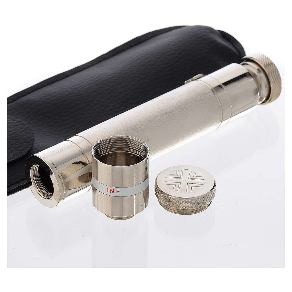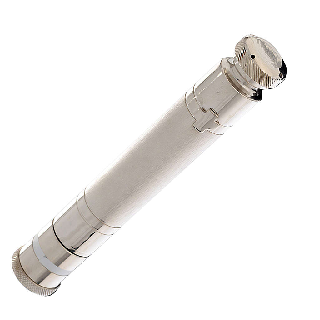 Aspergill mit Gläschen für Öle. Aspergill realisiert aus versilberten Messing mit Gläschen für Öle, mit Schrift INF.