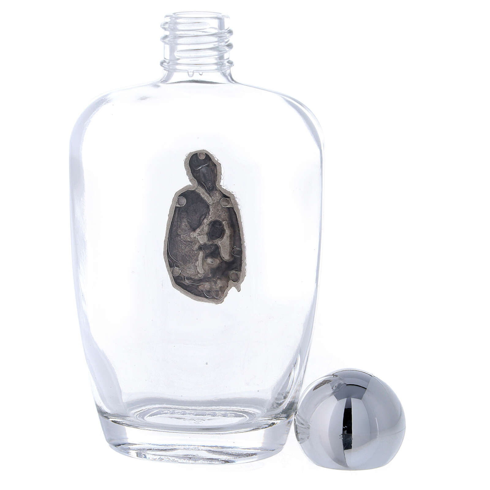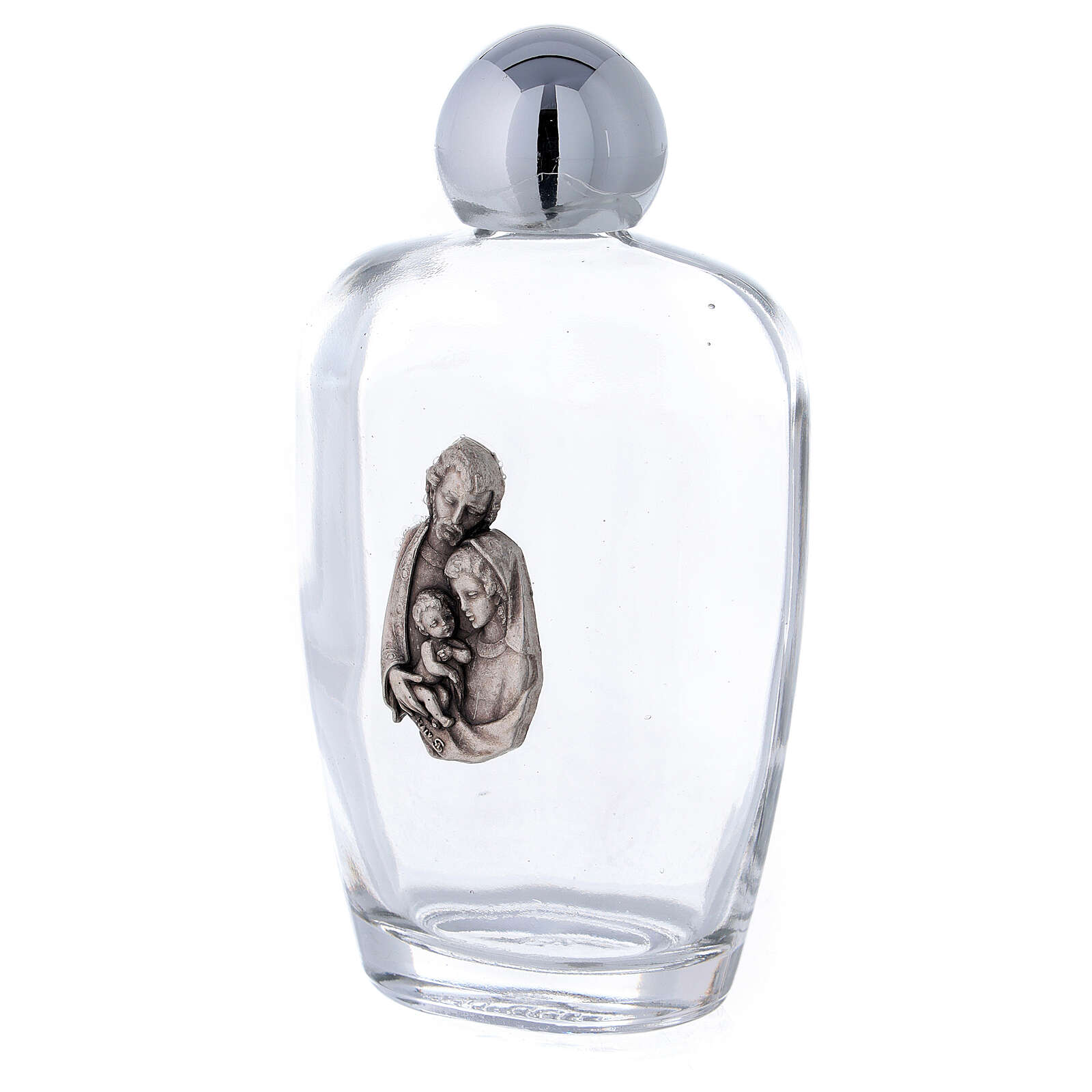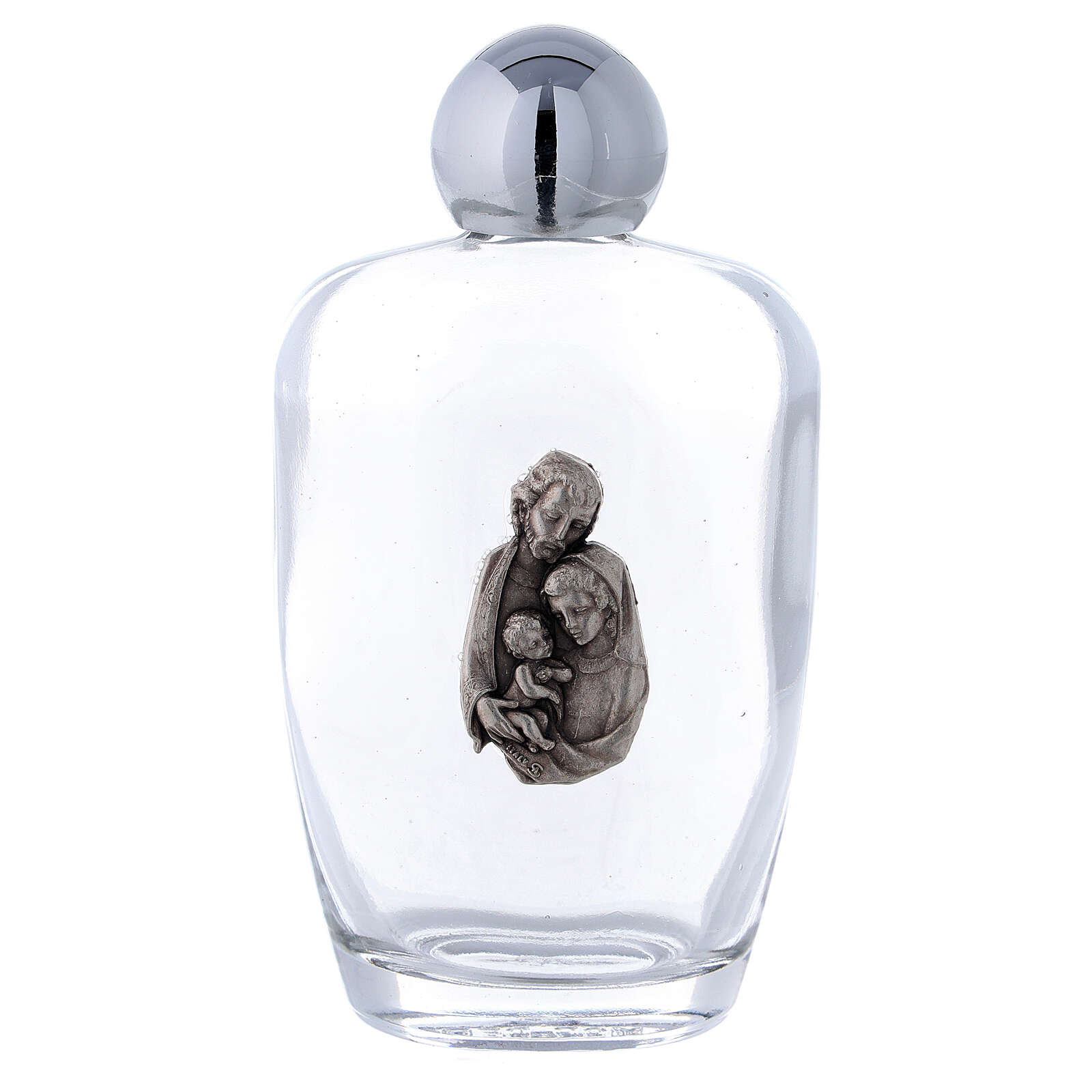 Weihwasserfläschchen aus Glas Heilige Familie (Packung 25St) 100ml. Weihwasserfläschchen von 100ml aus Glas in Packung von 25St. mit Bild der Heiligen Familie realisiert aus Metall und mit Plastikverschluss.