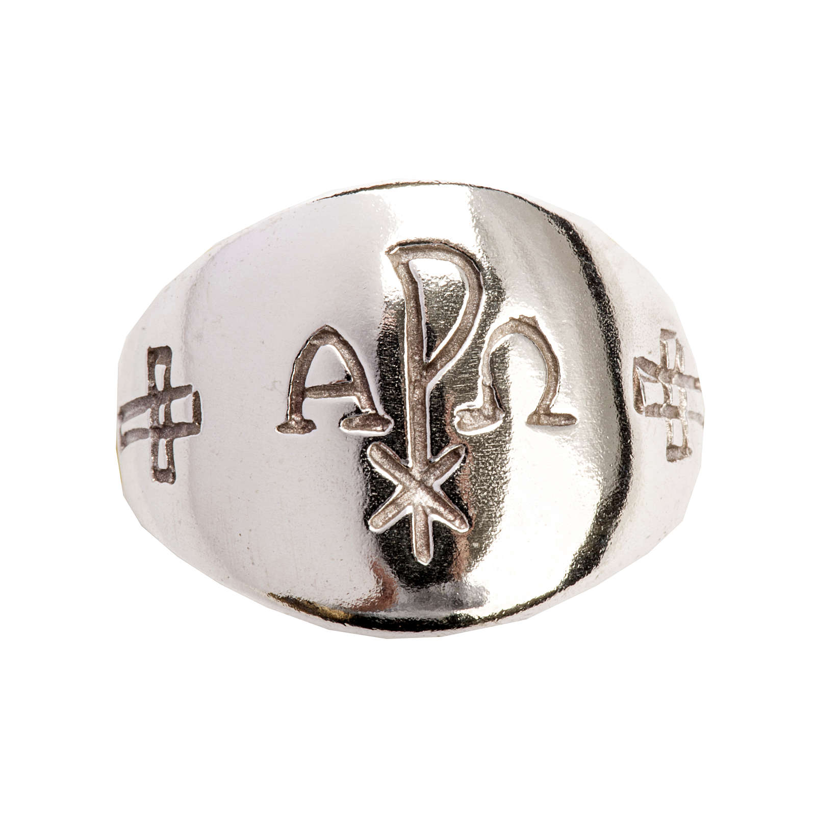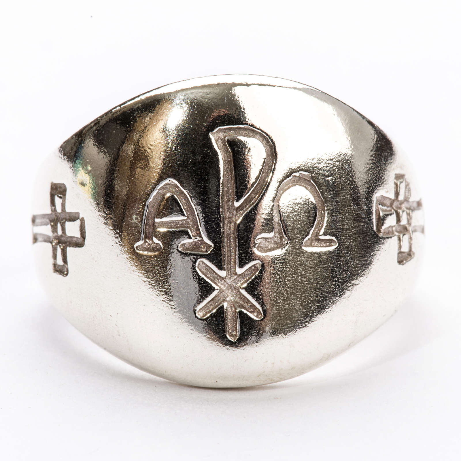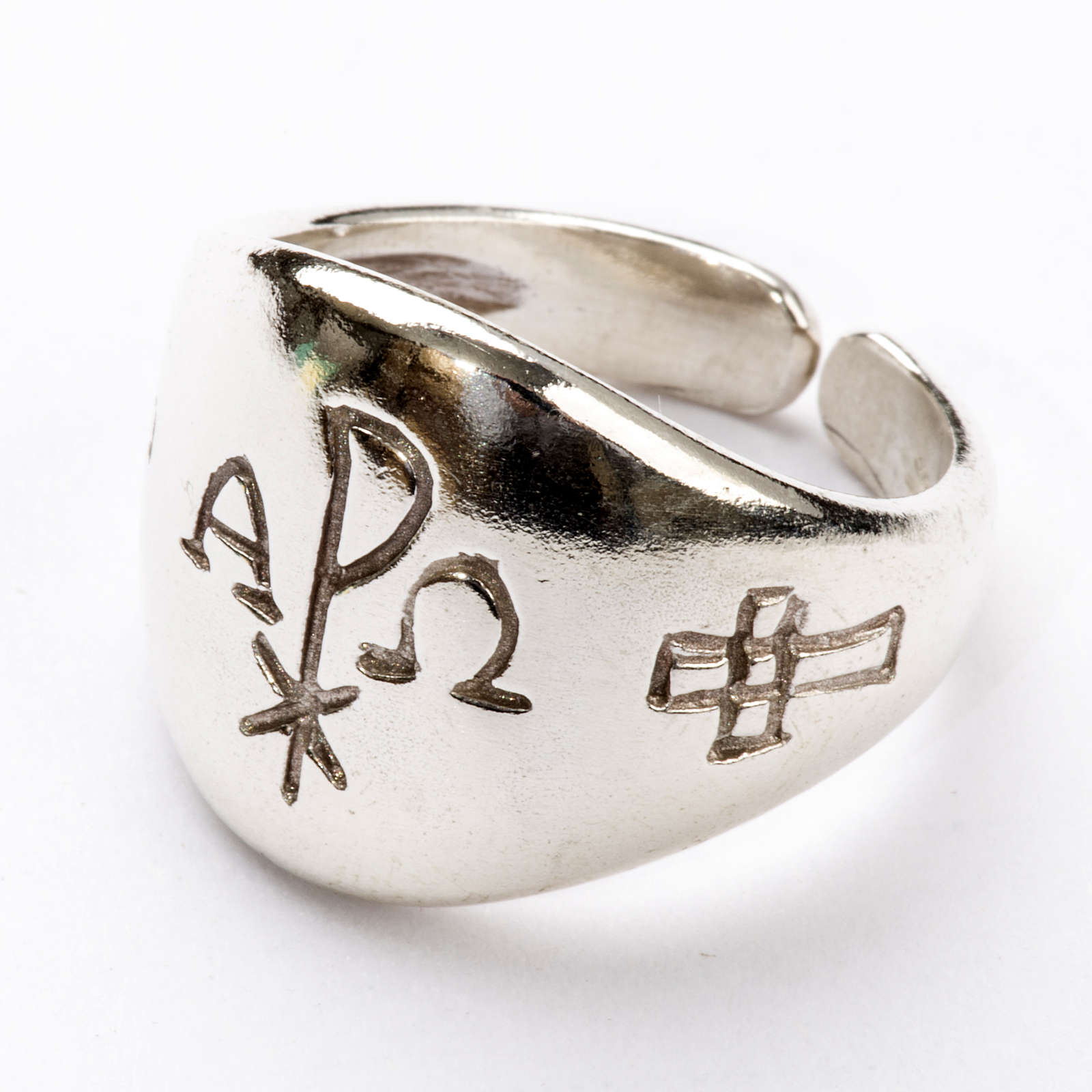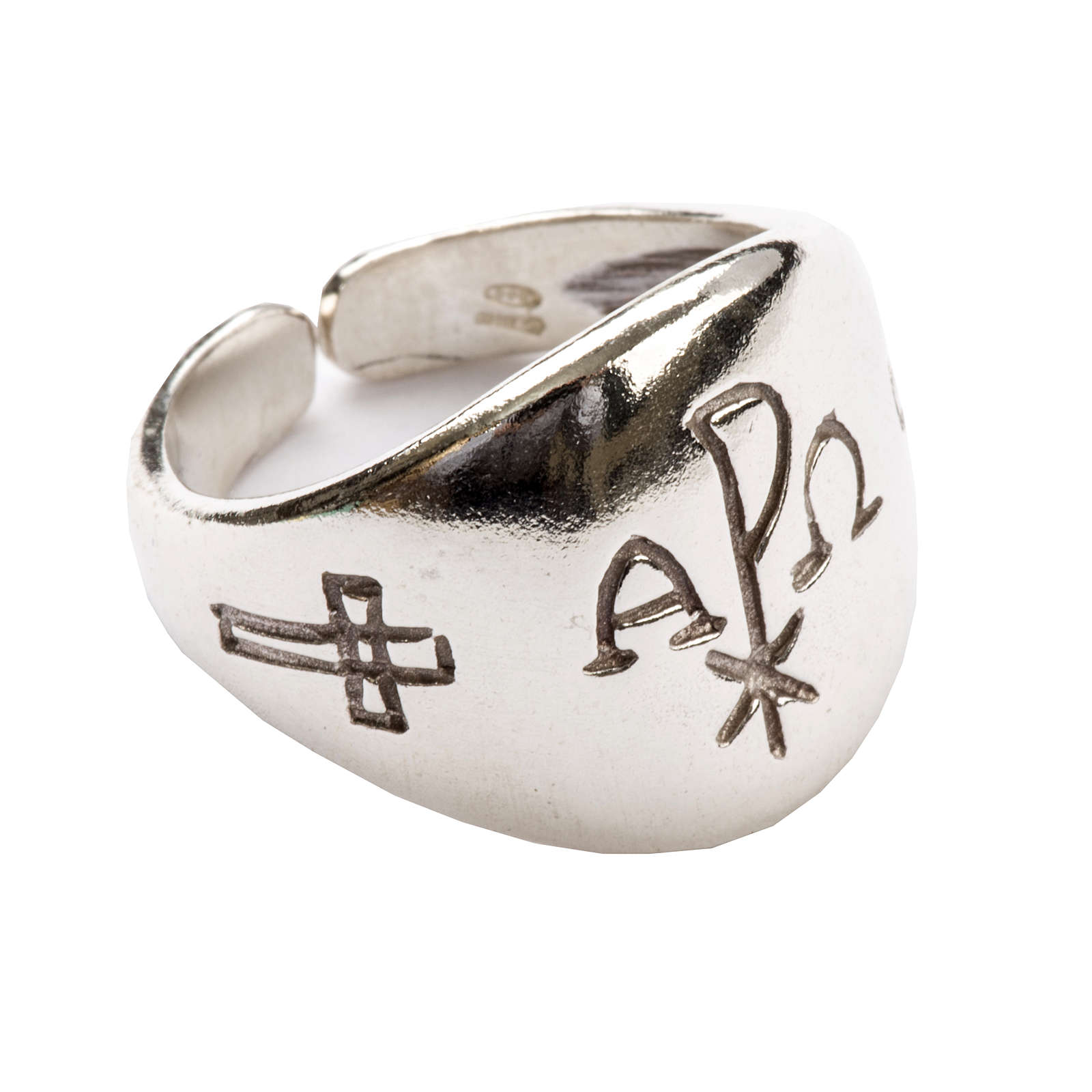 Bischofsring Alpha und Omega Silber 925. Der Ring ist aus Silber 925 realisiert und ist mit den Symbolen Alpha und Omega und XP dekoriert.